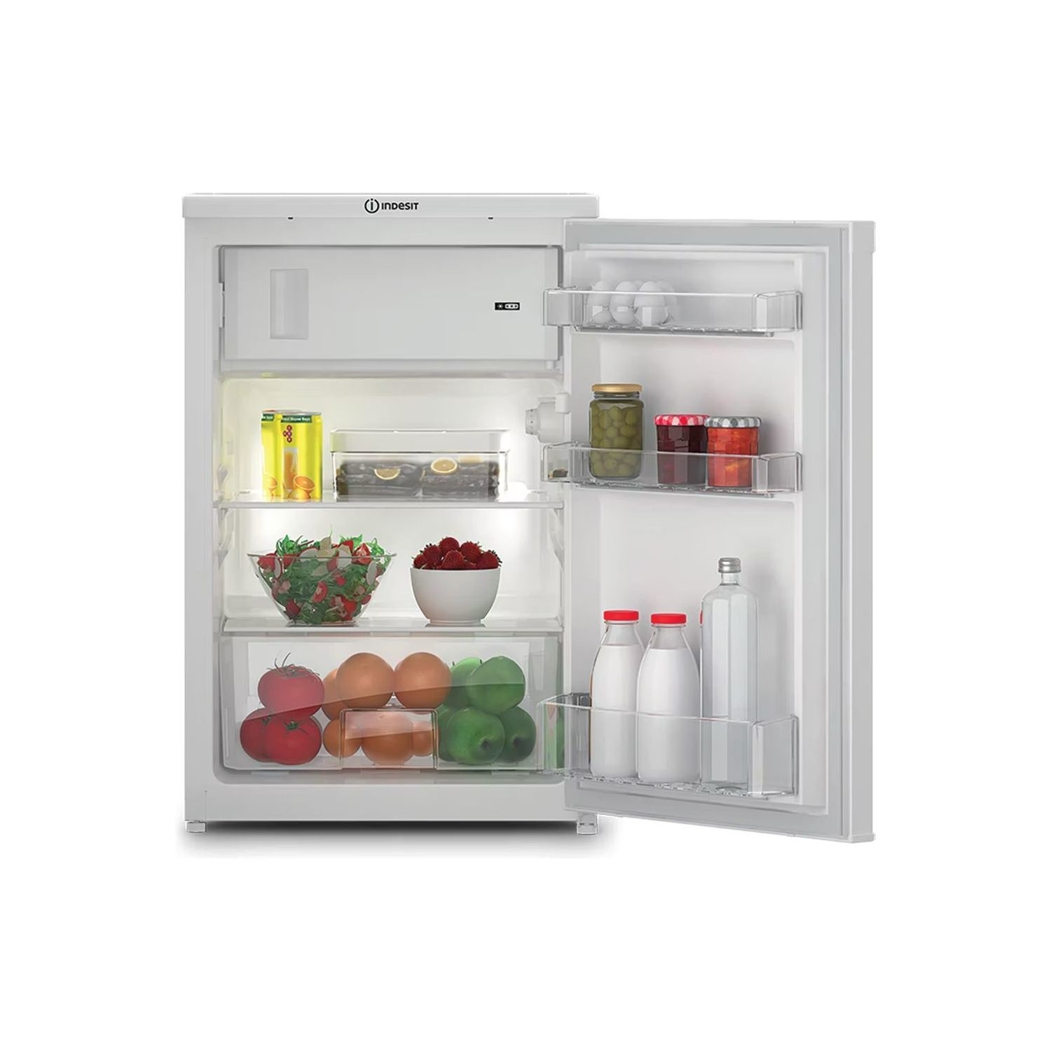 Make storing your food shop easier with this Indesit freestanding under counter fridge in white. It has a 114L capacity, giving you room for up to 6 shopping bags of groceries. Low Frost means less ice and more room inside for your food. Easy-to-clean glass shelves make it simpler than ever to keep your fridge frost-free. Inside you'll find a 4 Star freezer compartment for your frozen food, along with energy-efficient LED lighting which gives you maximum visibility of every shelf and corner. You can even customise your fridge to suit your needs. Adjustable shelves can create space for larger items, while the reversible door means you can place your appliance where you want.
