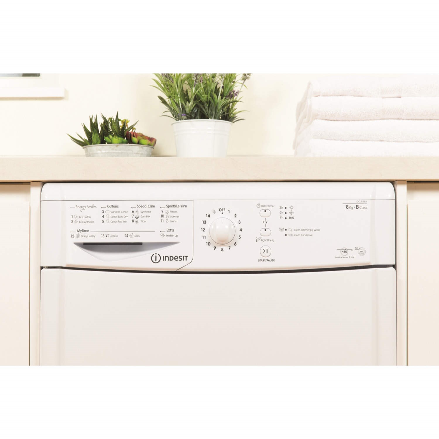 The Indesit EcoTime tumble dryer ensures maximum efficiency and energy saving with every drying cycle. With an 8kg loading capacity this tumble dryer is ideal for large households. Packed with a variety of special programmes there’s something to suit every load type. The Indesit EcoTime is a condenser dryer, requiring no venting you can place this tumble dryer anywhere in your home.