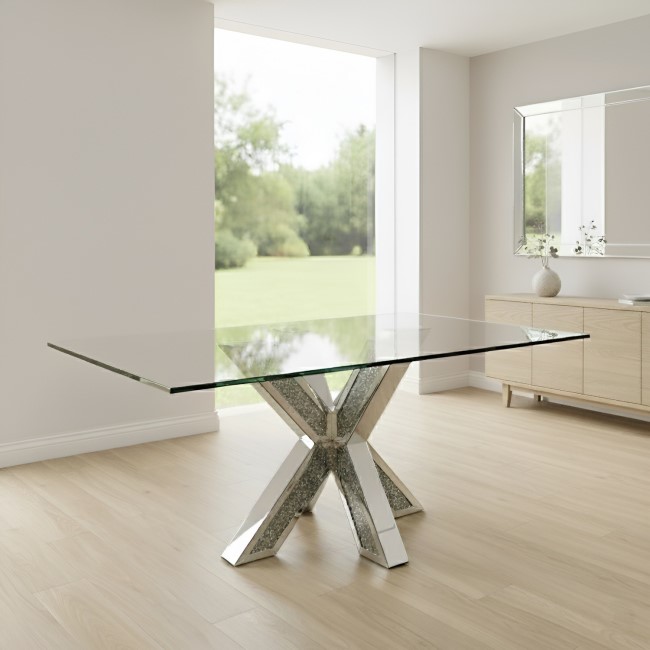 Transform your dining area with the exquisite Jade Boutique dining table. Featuring mirrored starburst legs with a glitter inlay and diamond-like crystal accents, it adds a touch of glamour and sophistication to any setting. The tempered glass top not only provides durability but also enhances the table’s sparkling elegance, making it a stunning centrepiece. With seating for 4–6 diners, it’s perfect for hosting intimate dinner parties or everyday family meals. Assembly is quick and simple, requiring just the glass top to be secured to the base.