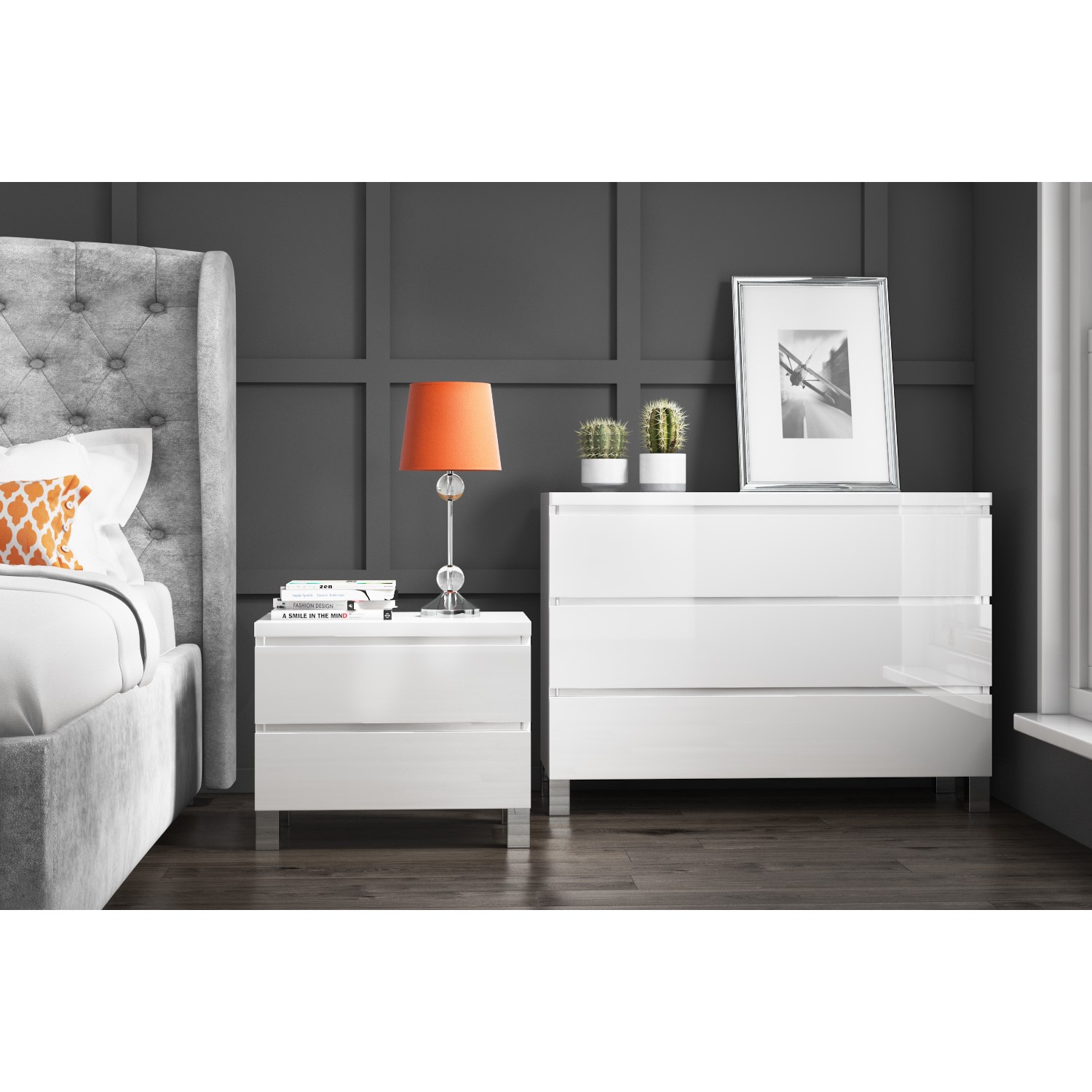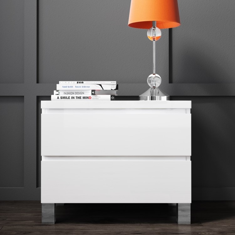 With two drawers it provides valuable storage for bedside essentials. The integrated drawer handless stylishly frame the drawers whilst complimenting the seamless design of the bedside table.