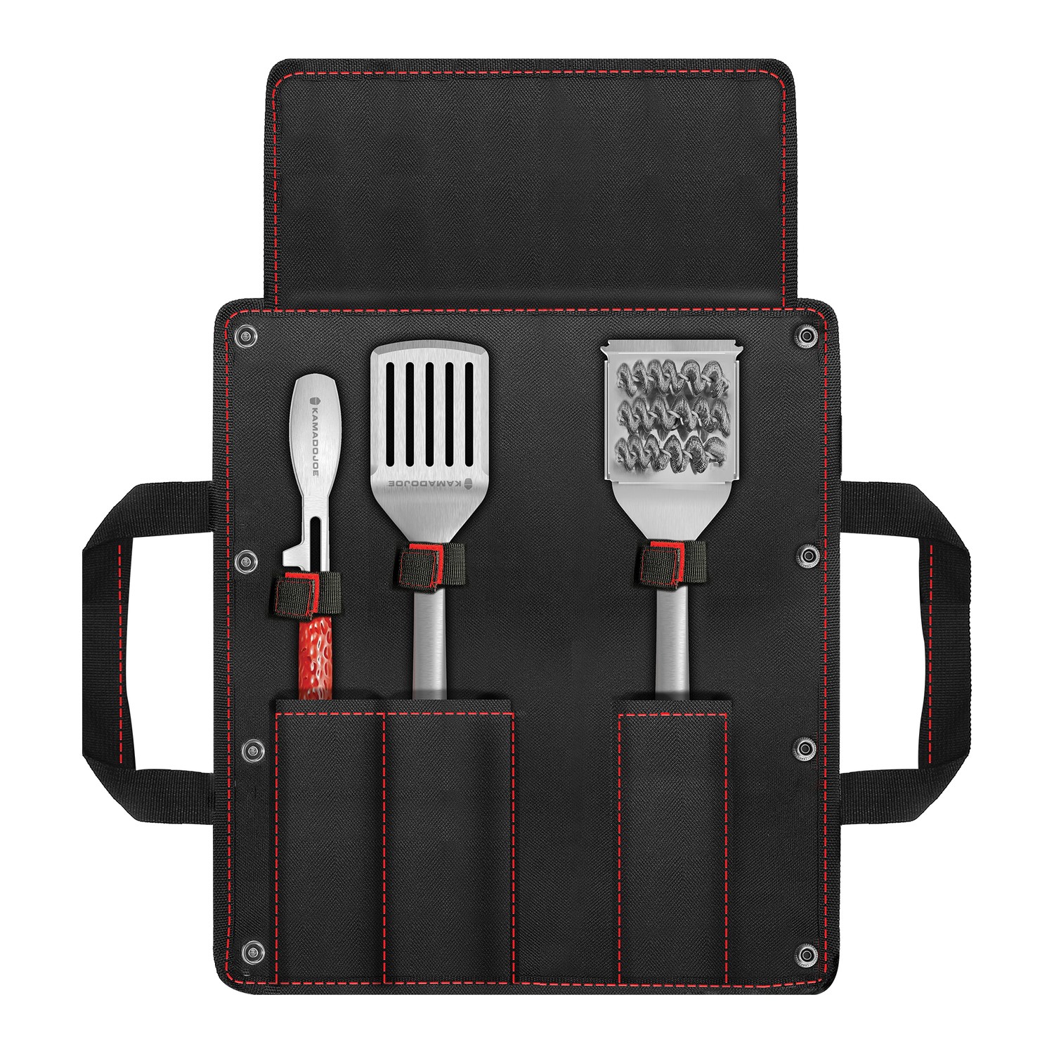 Every great cook deserves a quality toolset to complete their arsenal. The Kamado Joe® Krafted™ Steel Accessories Kit brings together an 18-inch spatula, tongs, and grill brush, each forged from heavy-duty stainless-steel with ergonomic handles, signature KJ dimpling, and bold red accents.