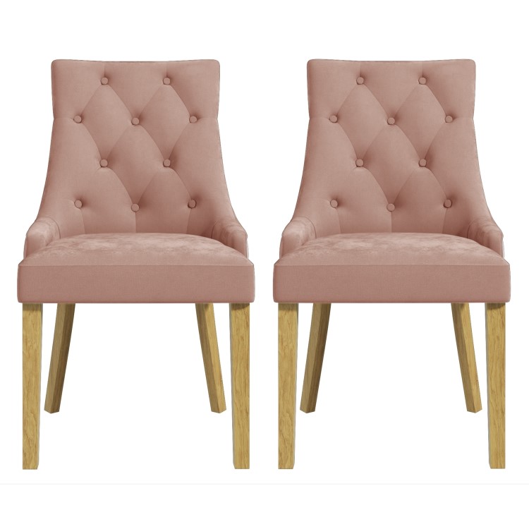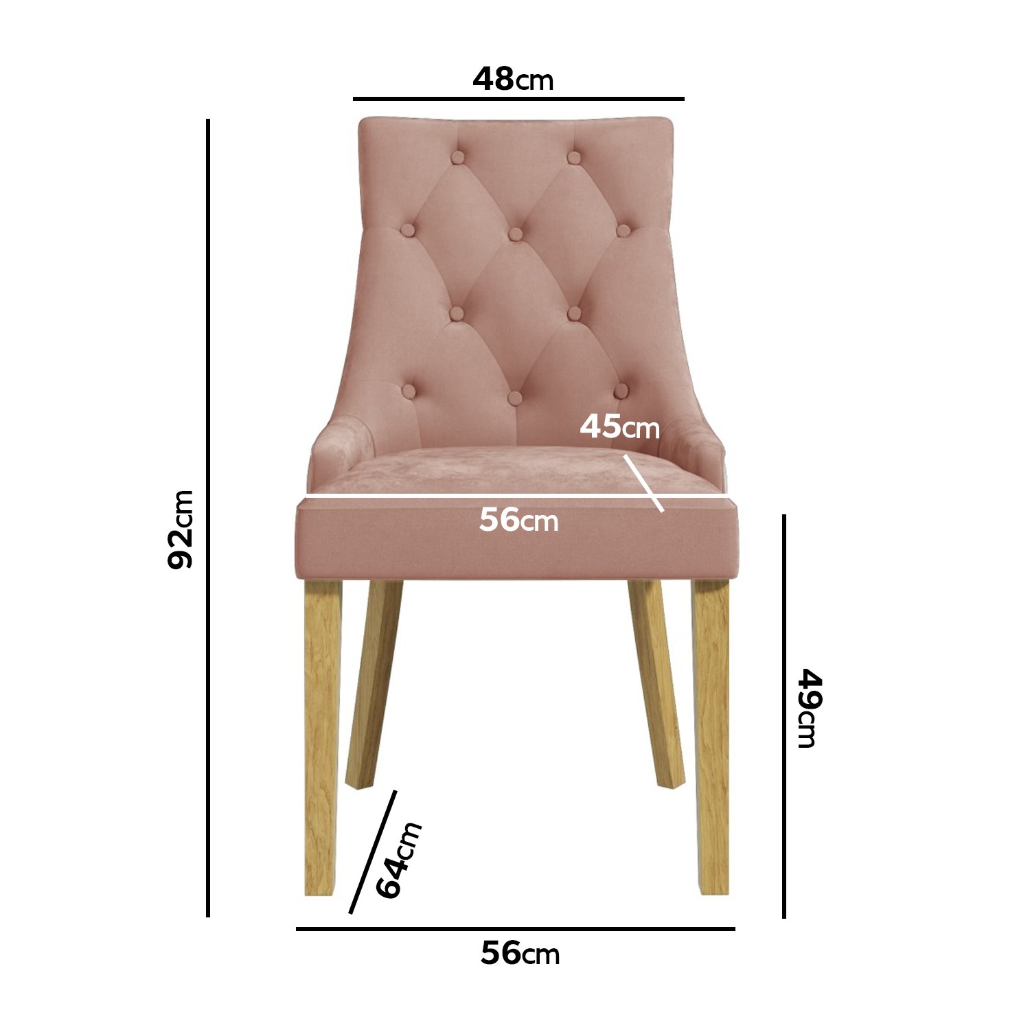 - Pink coloured velvet with elegant tapered chair legs with an oak effect finish