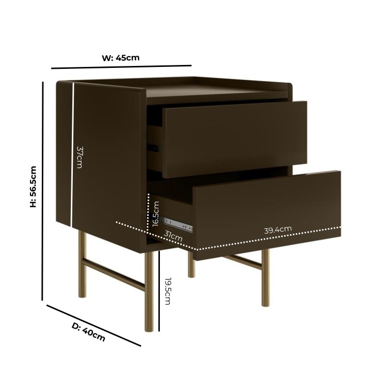 The Zane Bedside Table combines sleek, contemporary design with practical functionality. Its minimalist, handle-free form features two spacious push-to-open drawers on smooth metal runners, perfect for storing bedside essentials and keeping your bedroom organised. A subtle border around the top keeps surface items secure, while the warm khaki green matt finish and contrasting brushed-gold legs add a touch of understated luxury. Elevated for easy cleaning underneath and crafted from durable materials, the Zane bedside table is a stylish, modern, and long-lasting addition to any bedroom.
