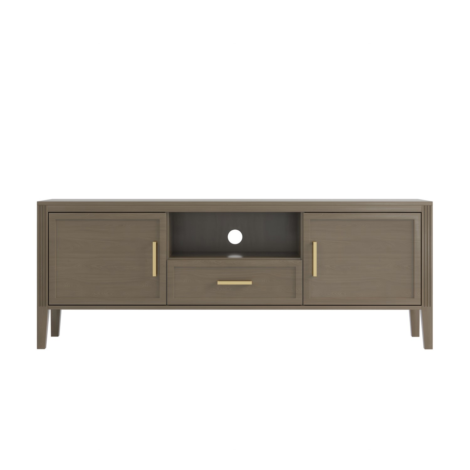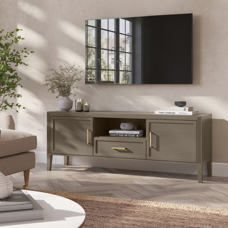 The Delilah Dark Wood TV Unit blends classic charm with modern sophistication, making it a stylish centrepiece for any living space. Crafted from solid pine with a rich dark wood finish, it features elegant fluted side details and refined brass accents that add a subtle touch of luxury. Designed with practicality in mind, the unit offers a combination of cupboards a shelf and a central drawer to neatly conceal media accessories, remotes and everyday clutter. The three built-in cable management holes keeps wires organised and out of sight, while the tapered legs create a light, elevated look that enhances the sense of space. Timeless yet contemporary, the Delilah TV Unit is the perfect balance of form and function for modern living rooms.