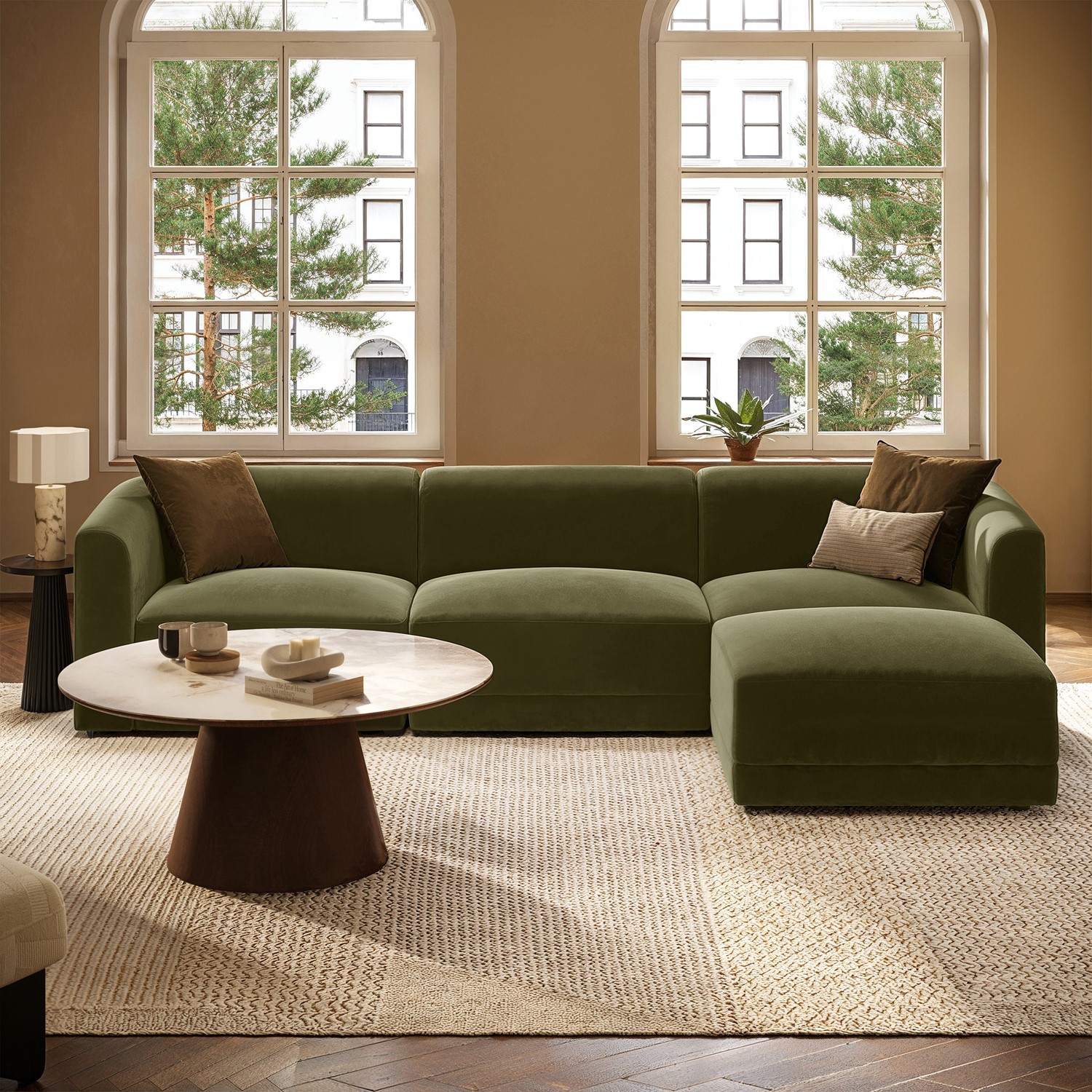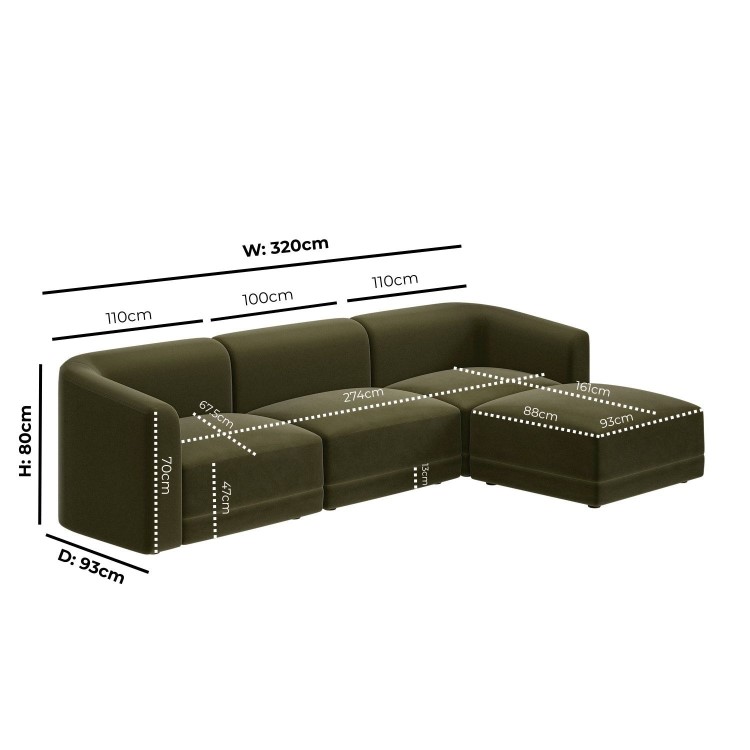 The Laine Large 4-Seater Modular Chaise Corner Sofa blends modern design with a bold, rounded silhouette and a soft, durable olive green velvet finish. Designed as a spacious family sofa, it features a movable chaise, deep seating, and a generous L-shaped form that adapts effortlessly to your space. Offering exceptional comfort and support, this stylish and inviting piece is the perfect centrepiece for relaxed, contemporary family living.