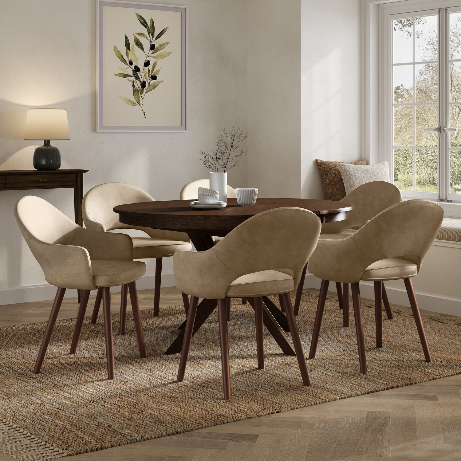 Paired with beige faux leather chairs making it the ideal combination of style and versatility, suiting a dining room setting or as occasion chairs for bedrooms and more. Sophisticated in their design, they can provide the finishing touch you've been striving for. Upholstered in a beige faux leather and finished off with sleek walnut legs, these chairs offer a timeless design and comfortable dining experience.