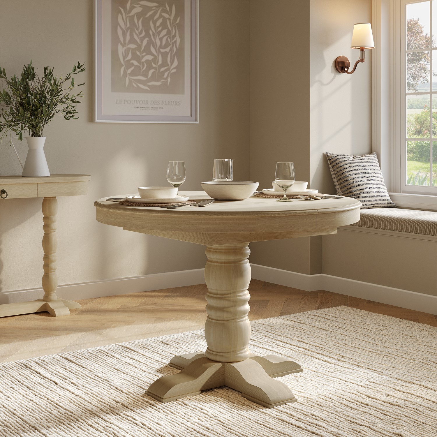 Bring classic farmhouse charm to your home with the Madeline Dining Table, crafted from solid pine with a washed rustic finish. Featuring cool-toned wood and elegant turned legs, it combines timeless style with lasting durability. Designed for flexibility, the round table extends to oval with a single leaf to accommodate extra guests. With its neutral tones and handcrafted detailing, it’s a perfect fit for both contemporary and rustic interiors, offering a functional and stylish centrepiece for family meals, gatherings, or relaxed coffee breaks.