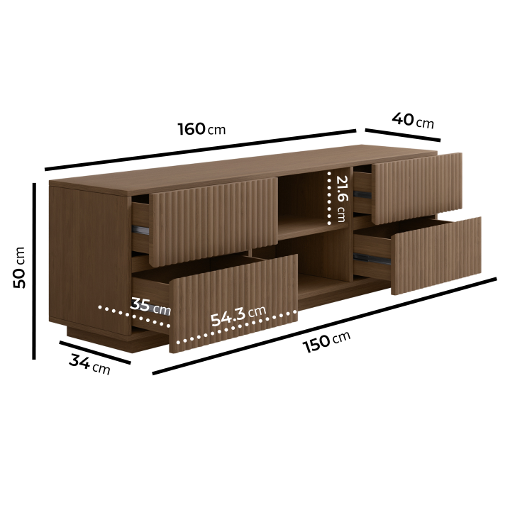 This contemporary freestanding TV unit combines clean lines with textured detailing to create a stylish focal point for your living room. The ribbed drawer fronts introduce subtle detail, while the natural walnut-effect finish adds warmth and balance to the overall design. Built with everyday use in mind, the unit features four spacious drawers for storing remotes and other items, as well as an open shelf for media devices. Two cable management cut-outs help maintain a tidy and organised TV setup.