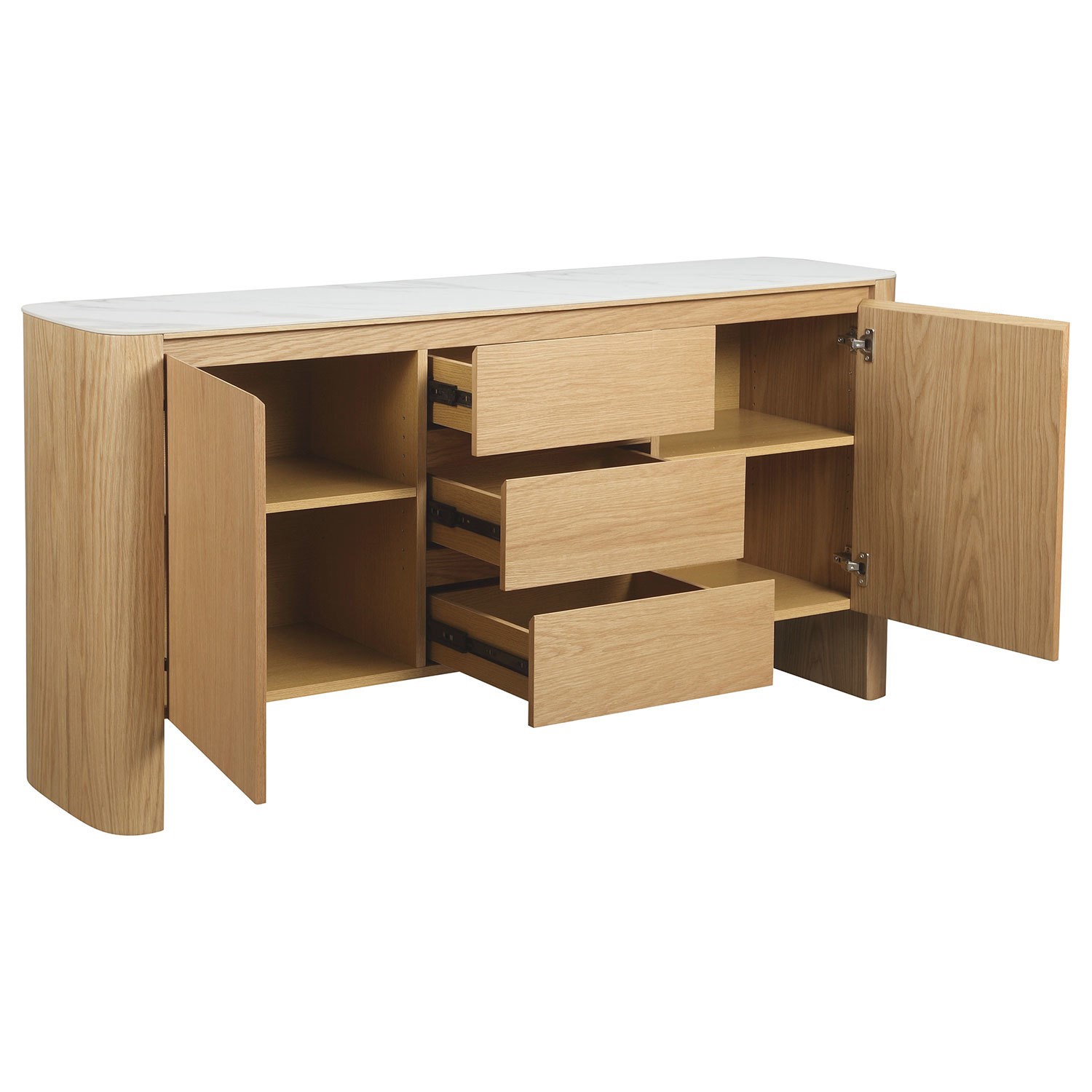 Crafted for both form and function, the Malia Oak Sideboard combines minimalist lines with natural materials to create a standout storage piece. With a premium oak veneer body and curved edge detailing, it softens its angular silhouette while maintaining a clean, modern presence. The marble-effect ceramic top introduces a layer of sophistication, offering a practical and heat-resistant surface. Inside, the combination of shelved cupboard space and three deep drawers provides flexible storage to keep everything neatly tucked away. Ideal for any space, this sideboard adds practical elegance to any room.