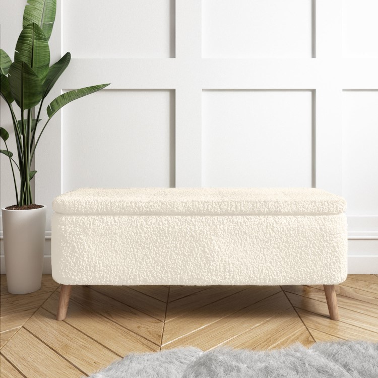 - Upholstered in a cosy teddy bear faux sheepskin fabric and contrasting wooden legs