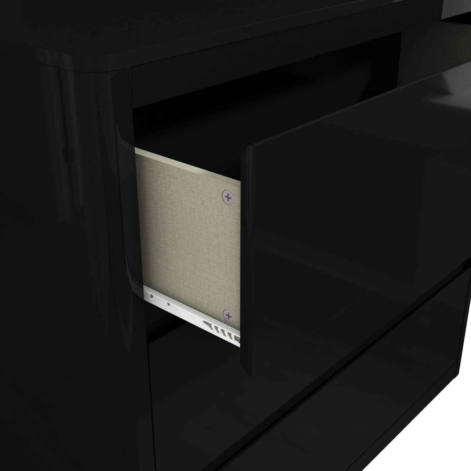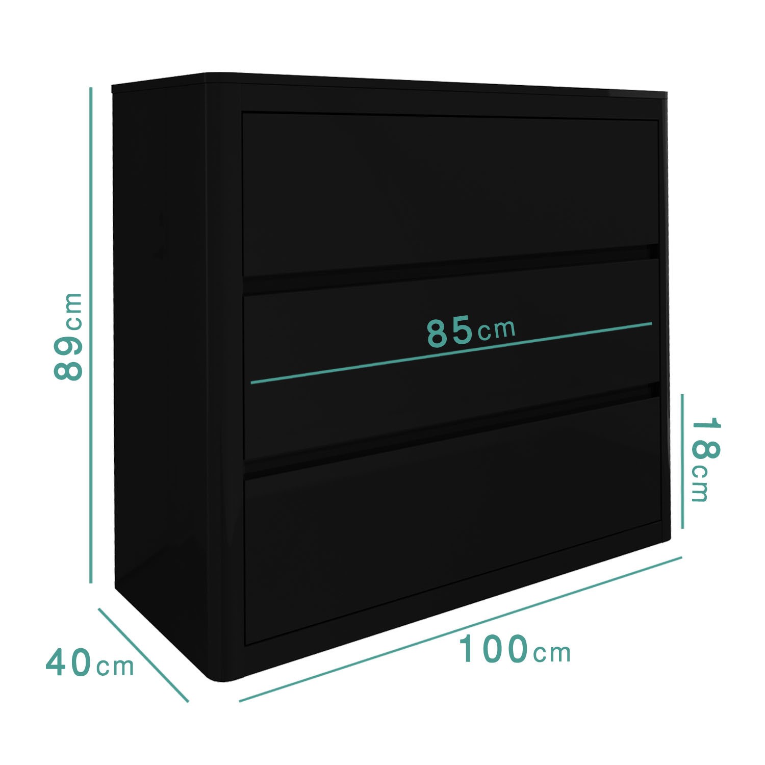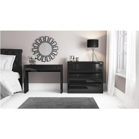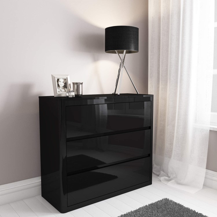 Store your folded items in style with this super sleek and seamless Lexi three drawer chest. It's the perfect piece to create a contemporary abode with its ultra-modern design. It has a clean and linear shape which features smooth curved corners along with integrated handles which give it a seamless look. The high gloss finish gives it a natural shine that will enhance the look of light and space in your room. In piano black it's easy to coordinate with any décor and it will look fresh and modern for years to come.
