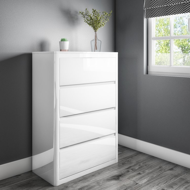 Store your folded items in style with this super sleek and seamless Lexi four drawer chest. It's the perfect piece to create a contemporary abode with its ultra-modern design. It has a clean and linear shape which features smooth curved corners along with integrated handles which give it a seamless look. The high gloss finish gives it a natural shine that will help enhance the look of light and space in your room. In pure white it's easy to coordinate with any décor and it will look fresh and modern for years to come.