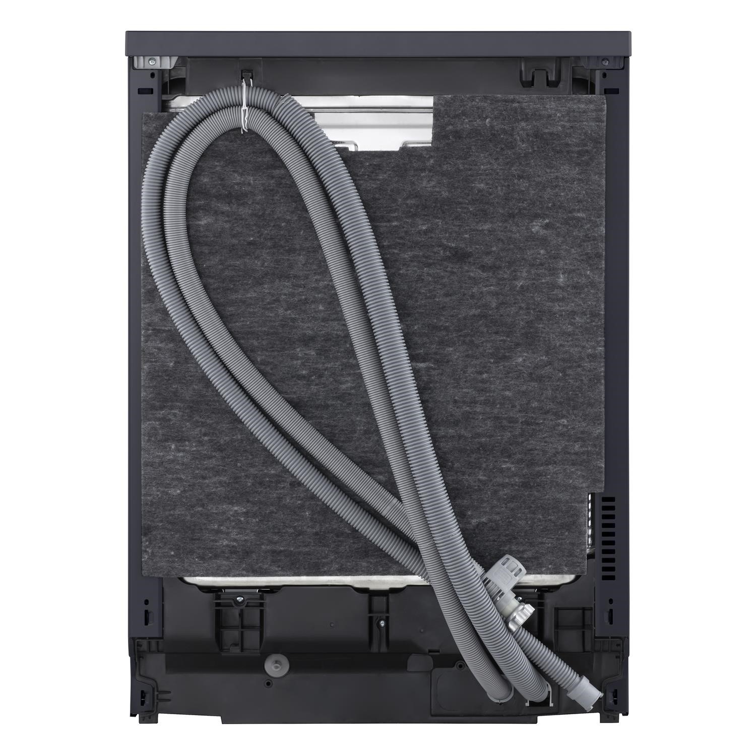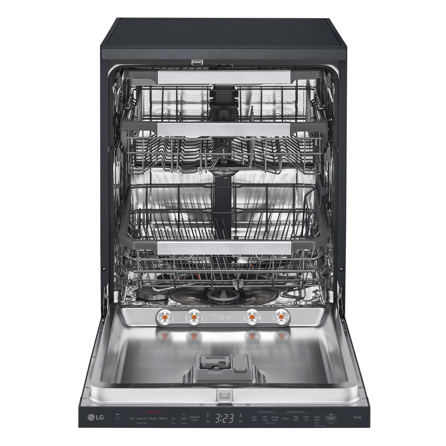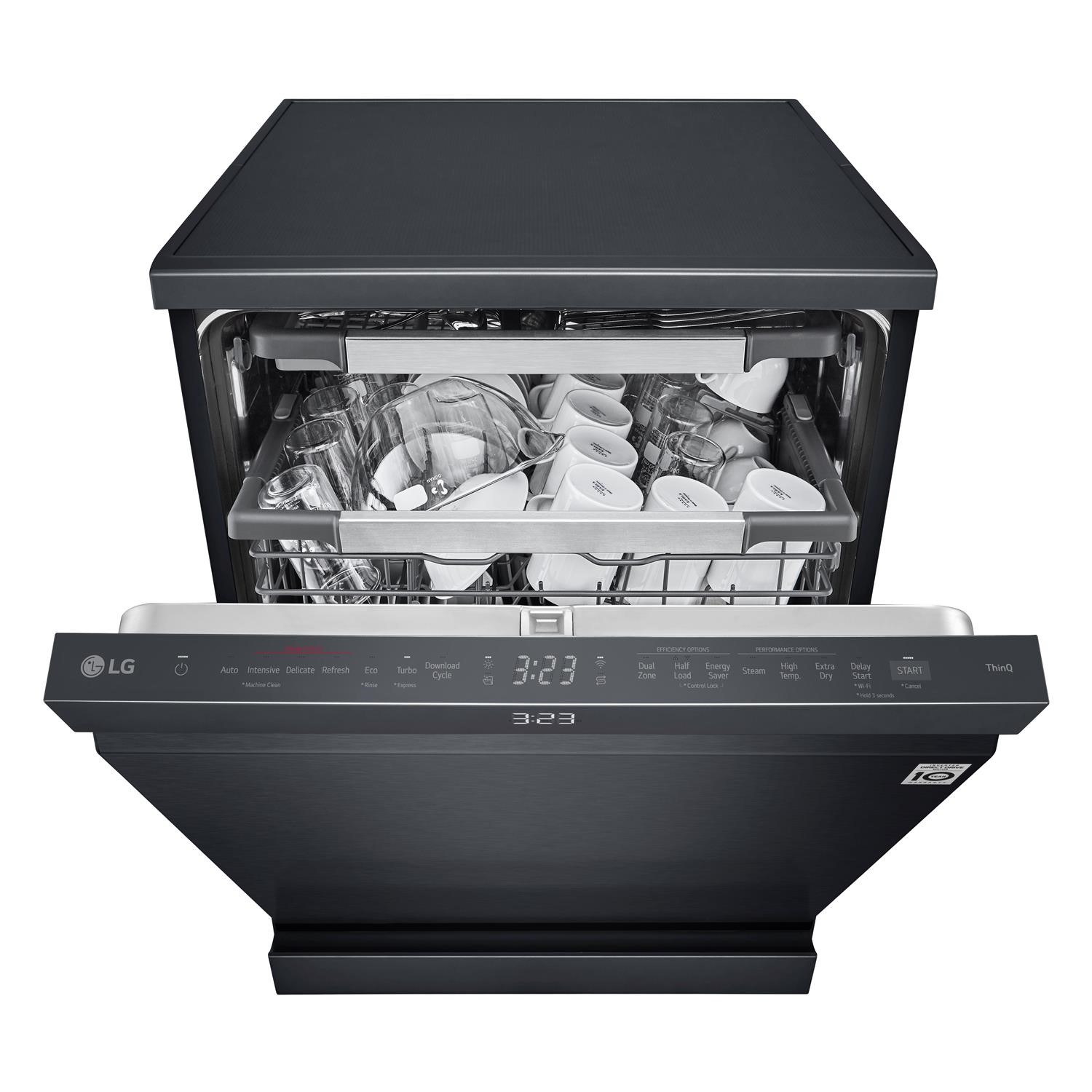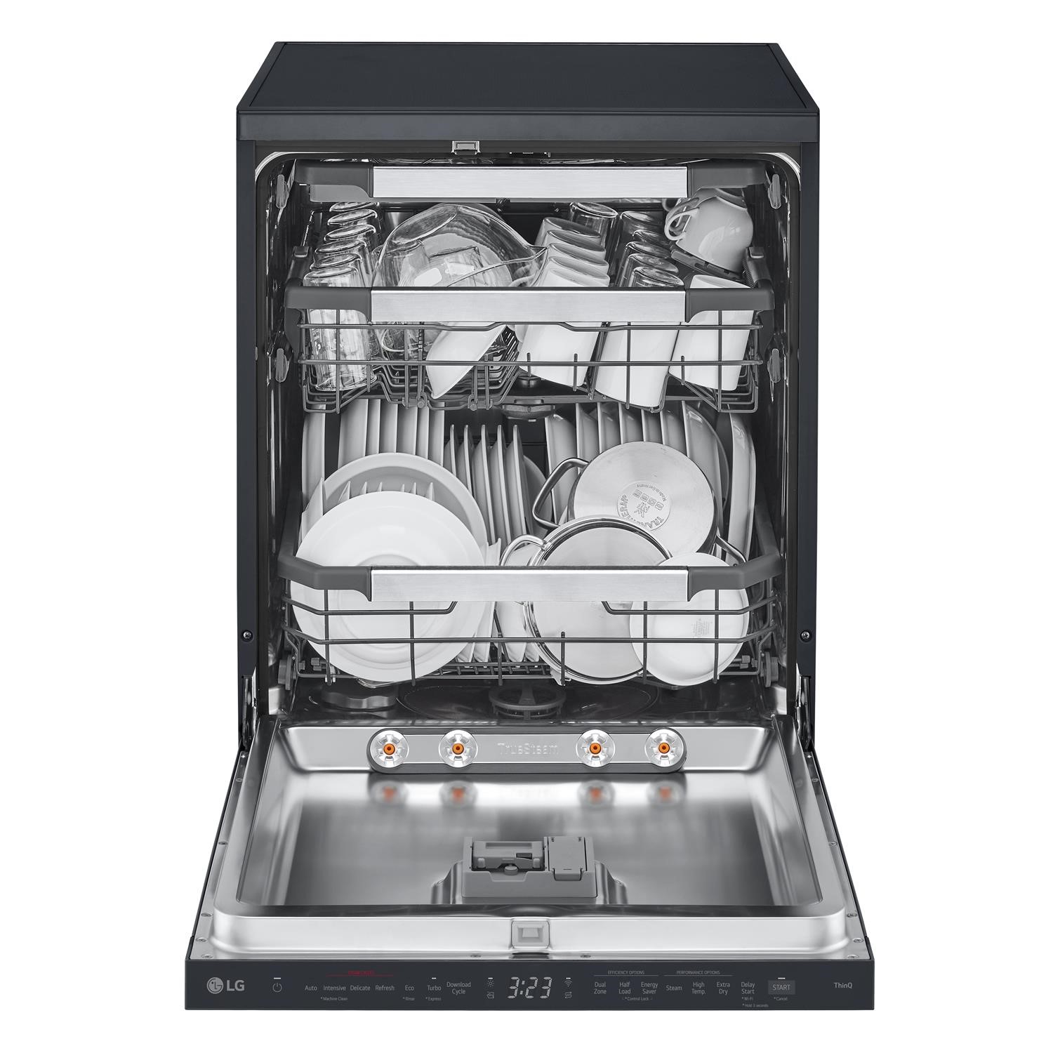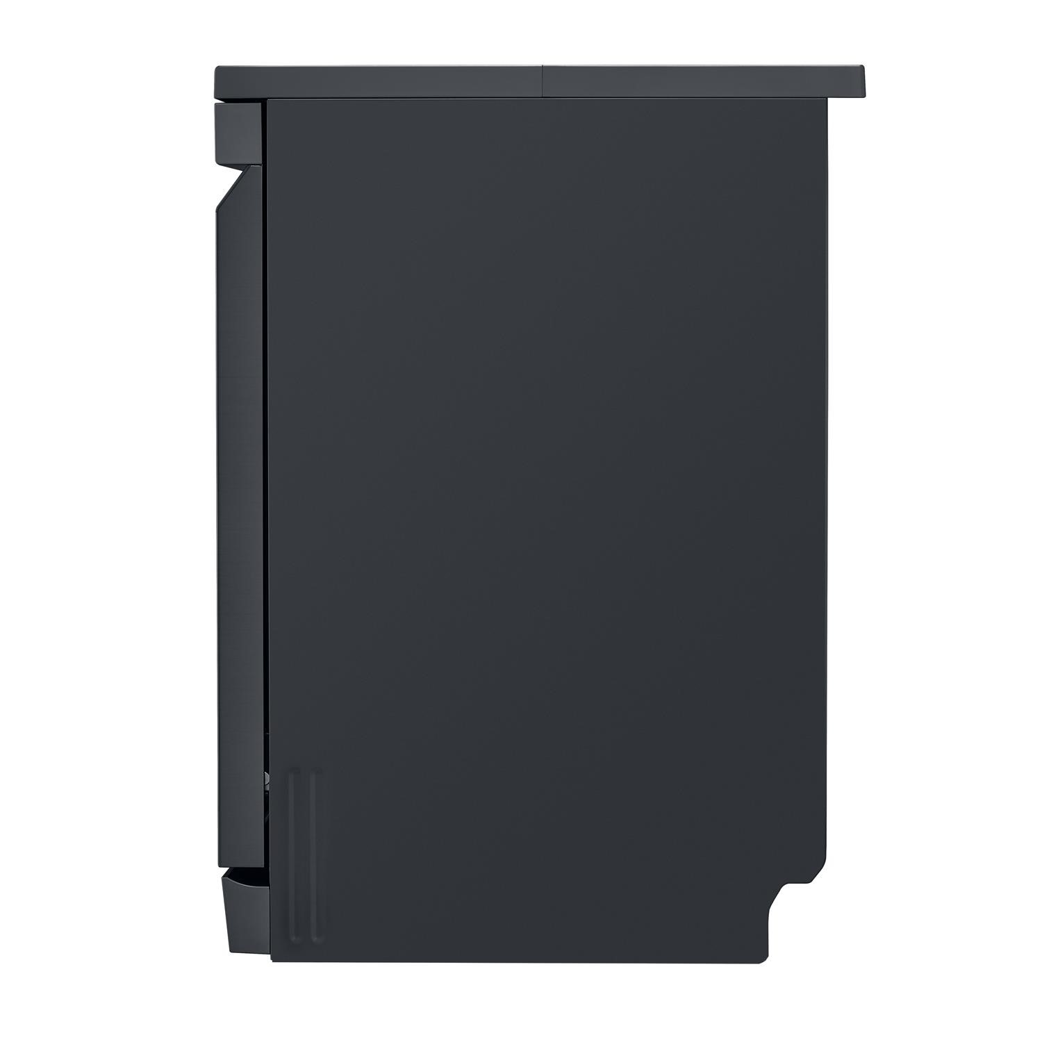 Get sparkling clean dishes every time with the LG TrueSteam DF587HMS full-size black dishwasher. Its sleek matte black finish looks great in any modern kitchen. With space for 14 place settings, it easily handles all your washing up, whether it's after a big family meal or a dinner party. The special TrueSteam technology uses steam to get rid of tough, baked-on food, making sure your plates are spotless and hygienic. Plus, the QuadWash system has four spray arms that reach every corner, so no dish is left dirty.