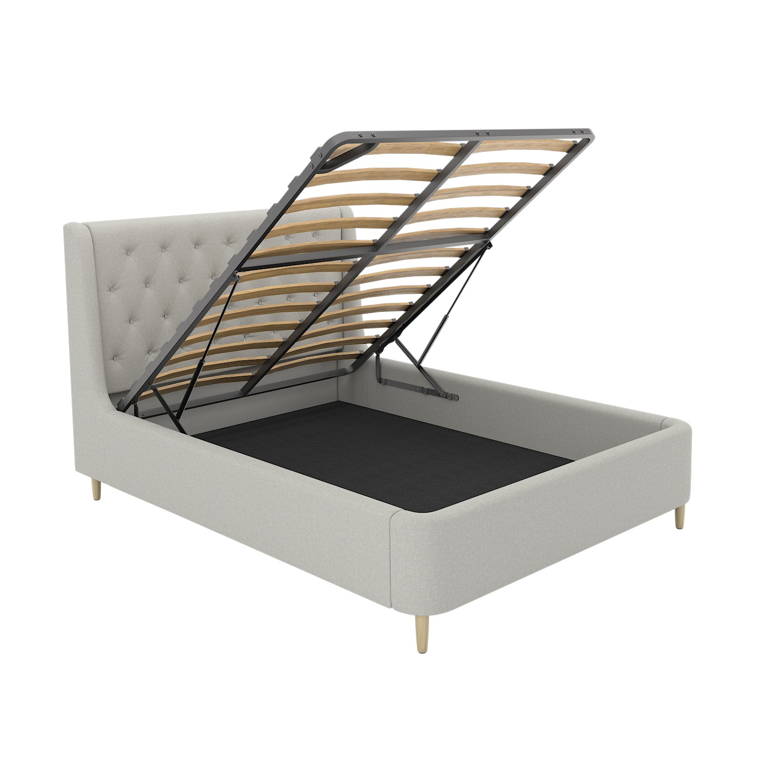 The Amara ottoman bed is guaranteed to make a stunning focal point in any bedroom, with a winged Chesterfield headboard and plenty of storage for your belongings. It features a sturdy sprung-slatted base and a gas-lift mechanism that ensures easy access to the space beneath. The storage base is wooden to protect stored items from dust. Upholstered in soft grey woven fabric, it perfectly complements the mid-century design, while the legs are crafted from beech wood with a light finish for a natural, timeless touch.