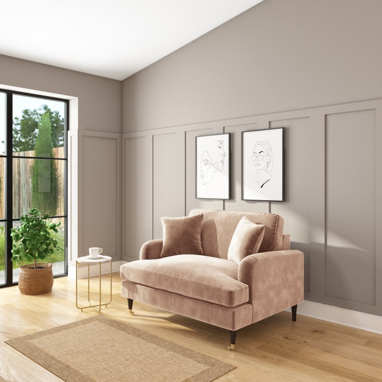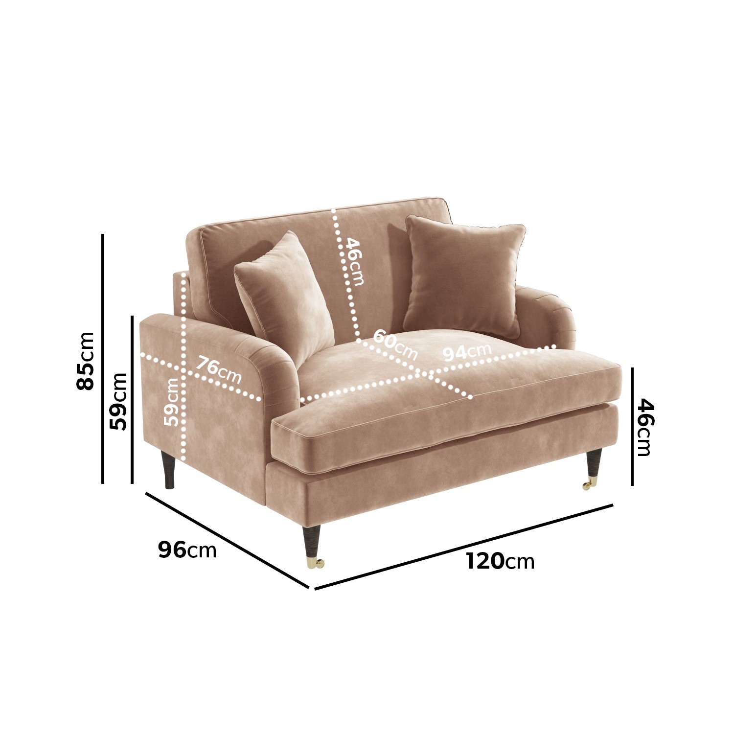 Discover maximum comfort and minimum maintenance with this gorgeous love seat. This plush Payton love seat offers traditional styling with a modern twist thanks to its dark wooden legs with gold accent front castors and classic ruched saddle arms. Beautifully tailored and upholstered in a pink, it brings a splash of natural warmth to your living space, making it the perfect statement piece. It comfortably seats 1 with space for 2 and comes accompanied with two matching throw cushions which add a final flourish of elegance.