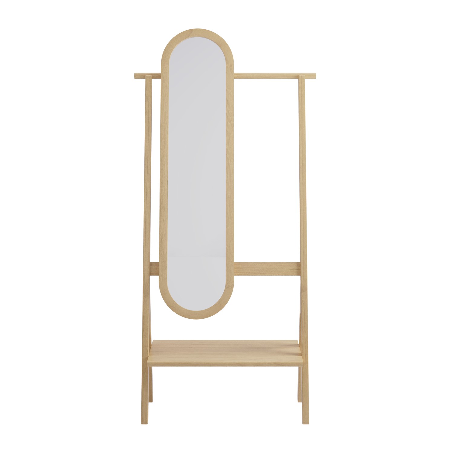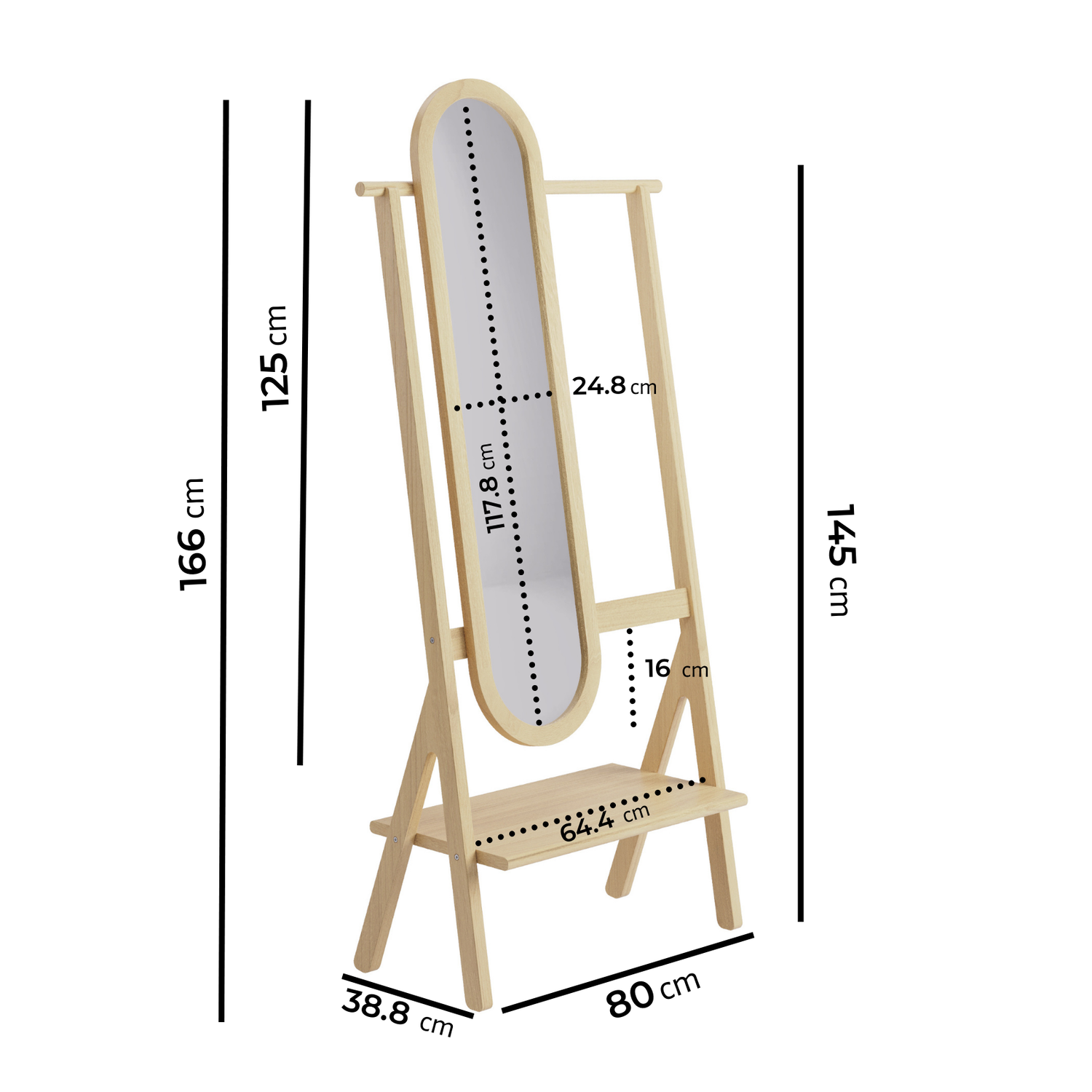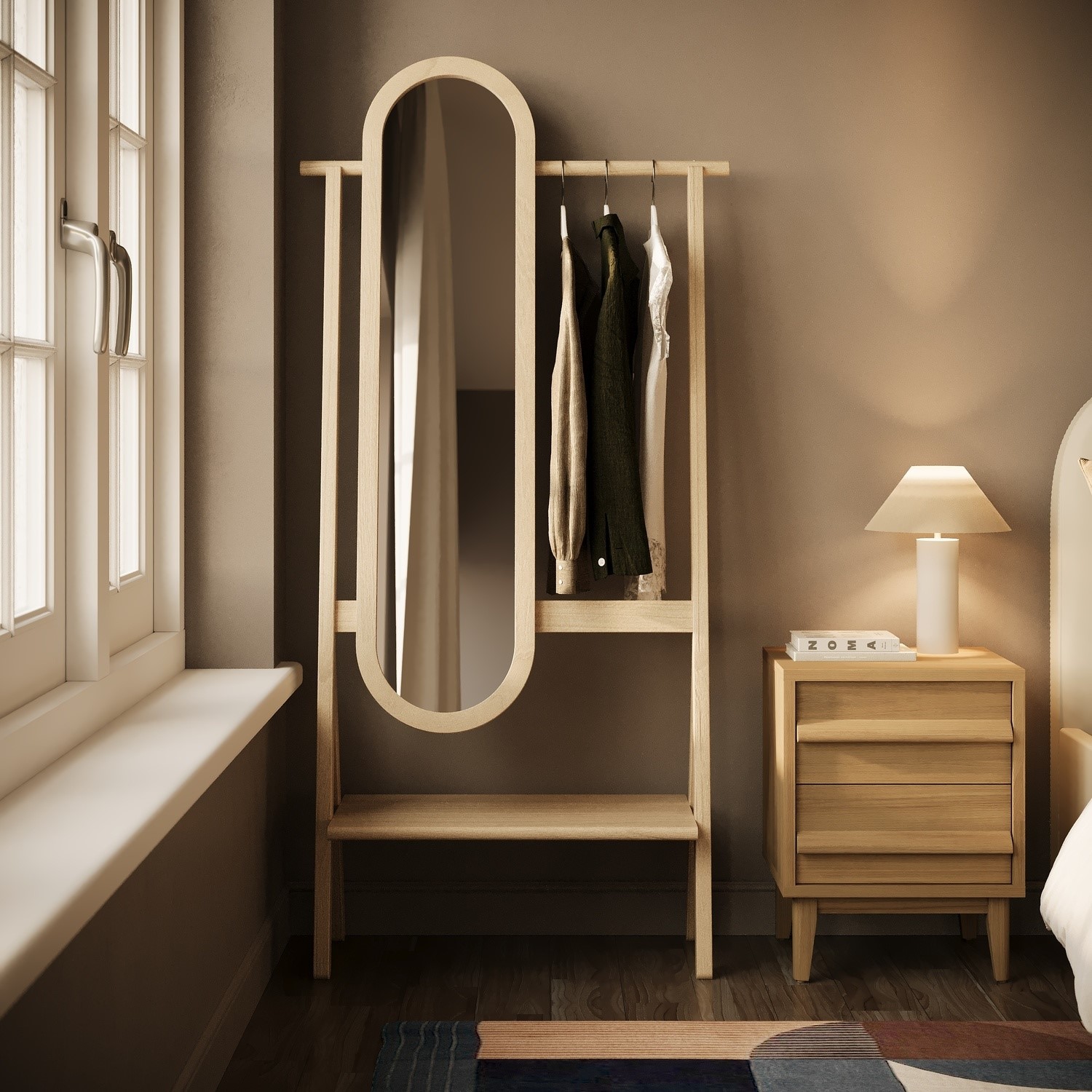 The Figo Full-Length Mirror with Hanging Rail is a stylish and practical addition to any bedroom, hallway, or dressing area. Designed with a sleek light wood frame, it combines a modern minimalist aesthetic with everyday functionality. The tall, full-length mirror provides a clear and flattering reflection, perfect for getting ready from head to toe. Integrated into the frame is a convenient hanging rail, ideal for organising outfits, storing coats, or keeping daily essentials within reach. A lower shelf adds extra storage space for shoes, bags, or decorative pieces, making this mirror a smart space-saving solution. Blending practicality with contemporary design, the Figo Mirror elevates your home with both elegance and purpose.