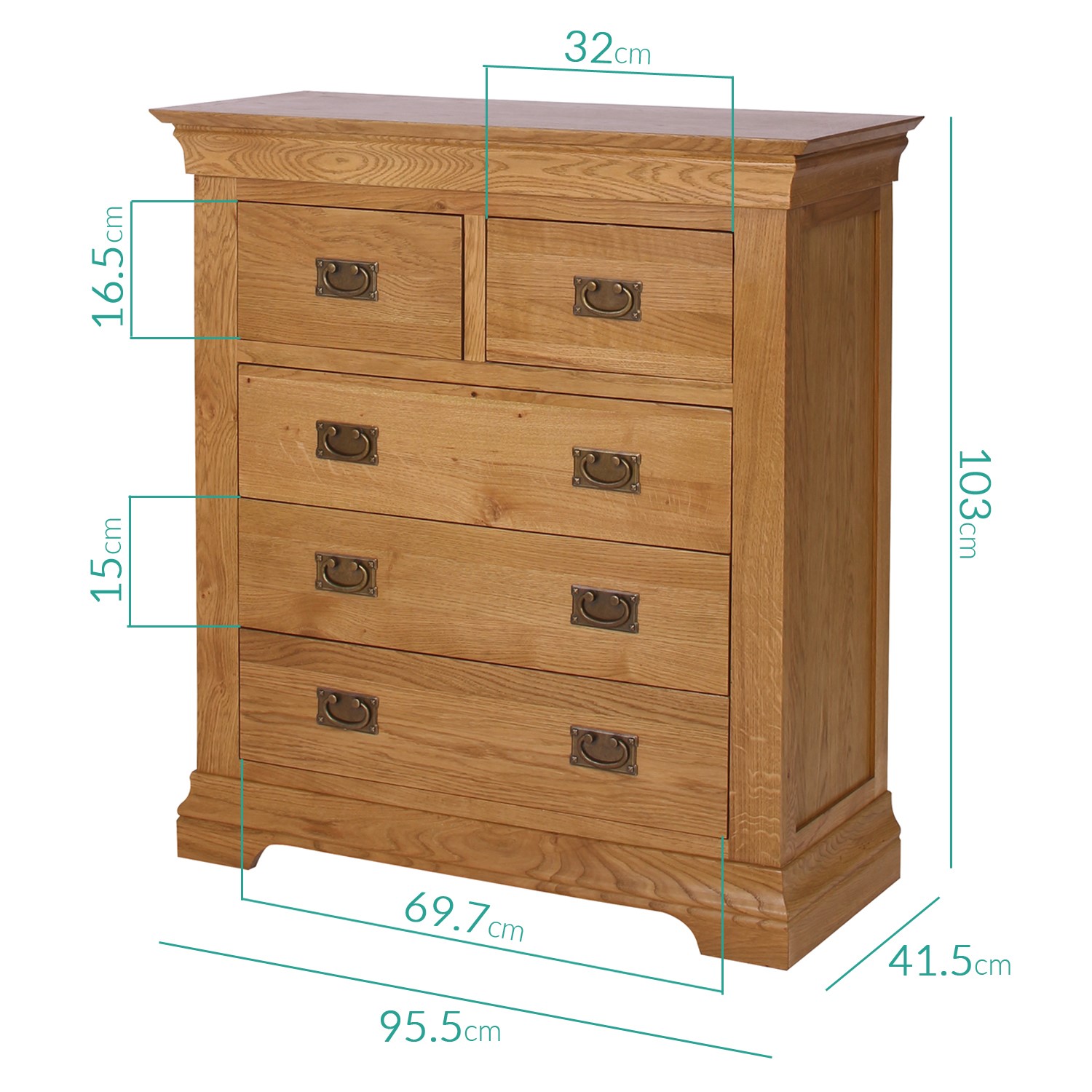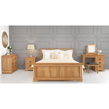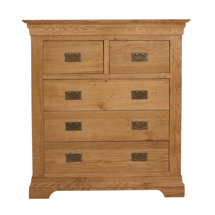 This Loire chest of drawers oozes quality thanks to its solid oak build. With a classic design featuring flared cornices and a thick top it has a timeless look, making it the perfect addition to both traditional and modern homes. The oak finish is absolutely stunning, with a beautiful wood grain and honey tones, it has a natural feel which brings a sense of warmth to your space. Hung iron effect handles in an antique brass finish compliment the chest, adding a rustic touch of styling.