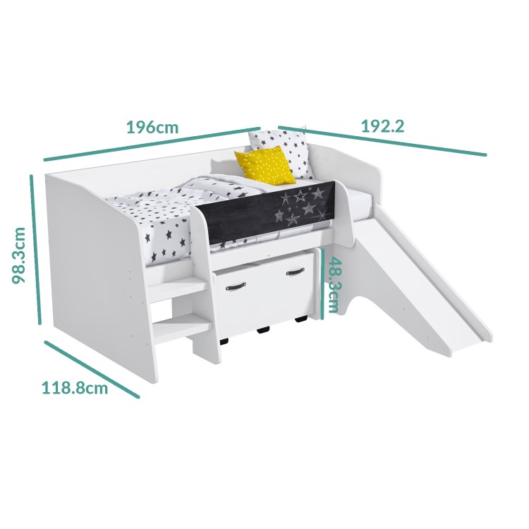 Bring bedroom dreams to life with this fun single bed for kids. The built-in slide provides endless entertainment for little ones and is also a fun way to get them into bed. With the under-bed storage box, you can store toys and books away and save on floor space. The neutral white wooden styling fits perfectly with any bedroom interior. Fits a standard size UK single mattress - mattress sold separately.