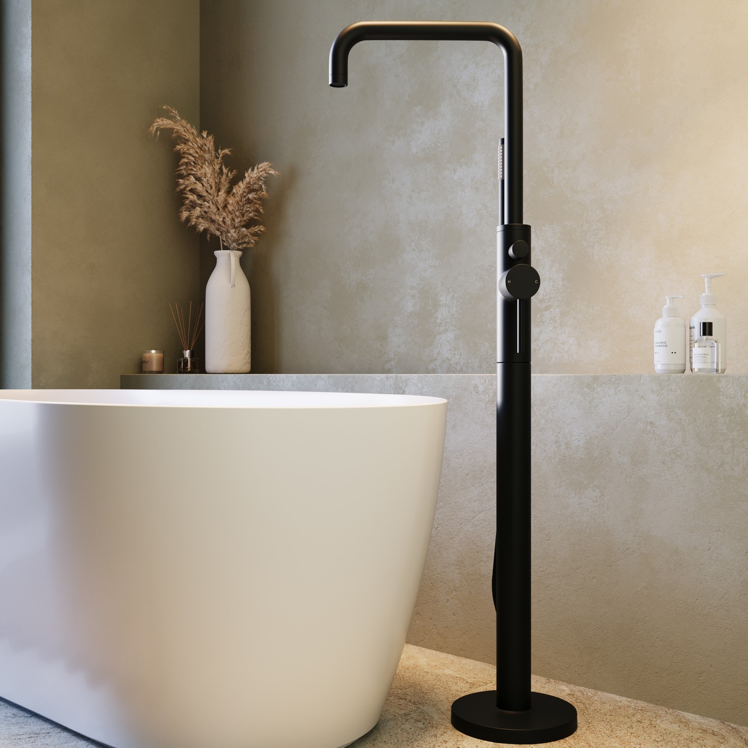 - Stylish freestanding matt black tap, with bath filler and shower handset