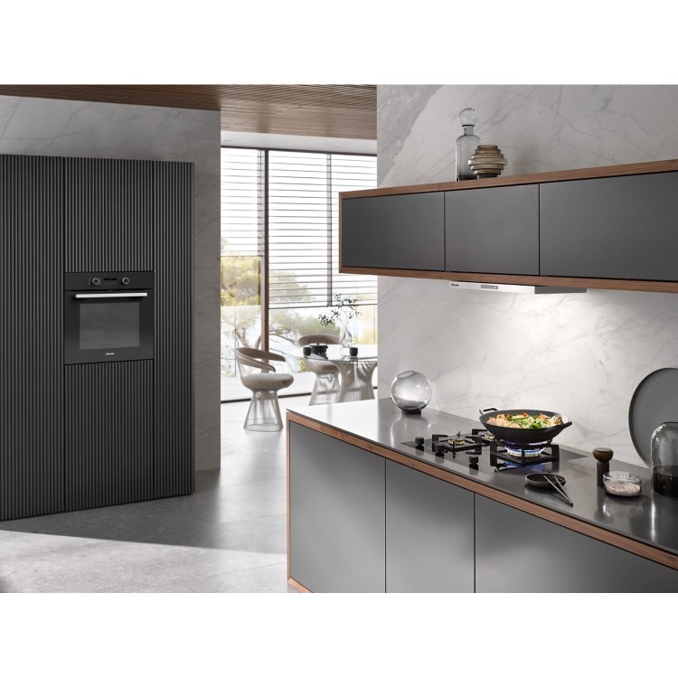 Miele ovens are cooled on all sides. This ensures that controls, handles and adjacent cabinets stay relatively cool to the touch. The multi-layer panels insulate the oven door effectively and ensure a low temperature on the outside of the door, providing safety and protection against burns.