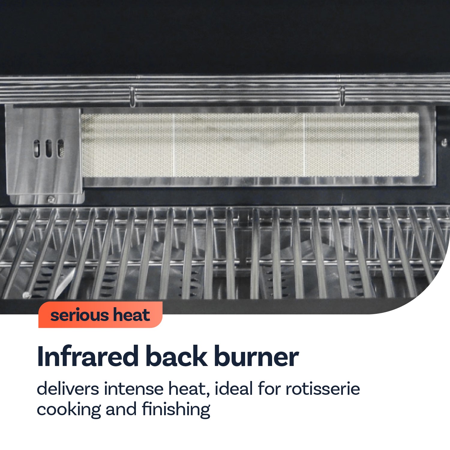 Delivers intense heat, ideal for rotisserie cooking and finishing.