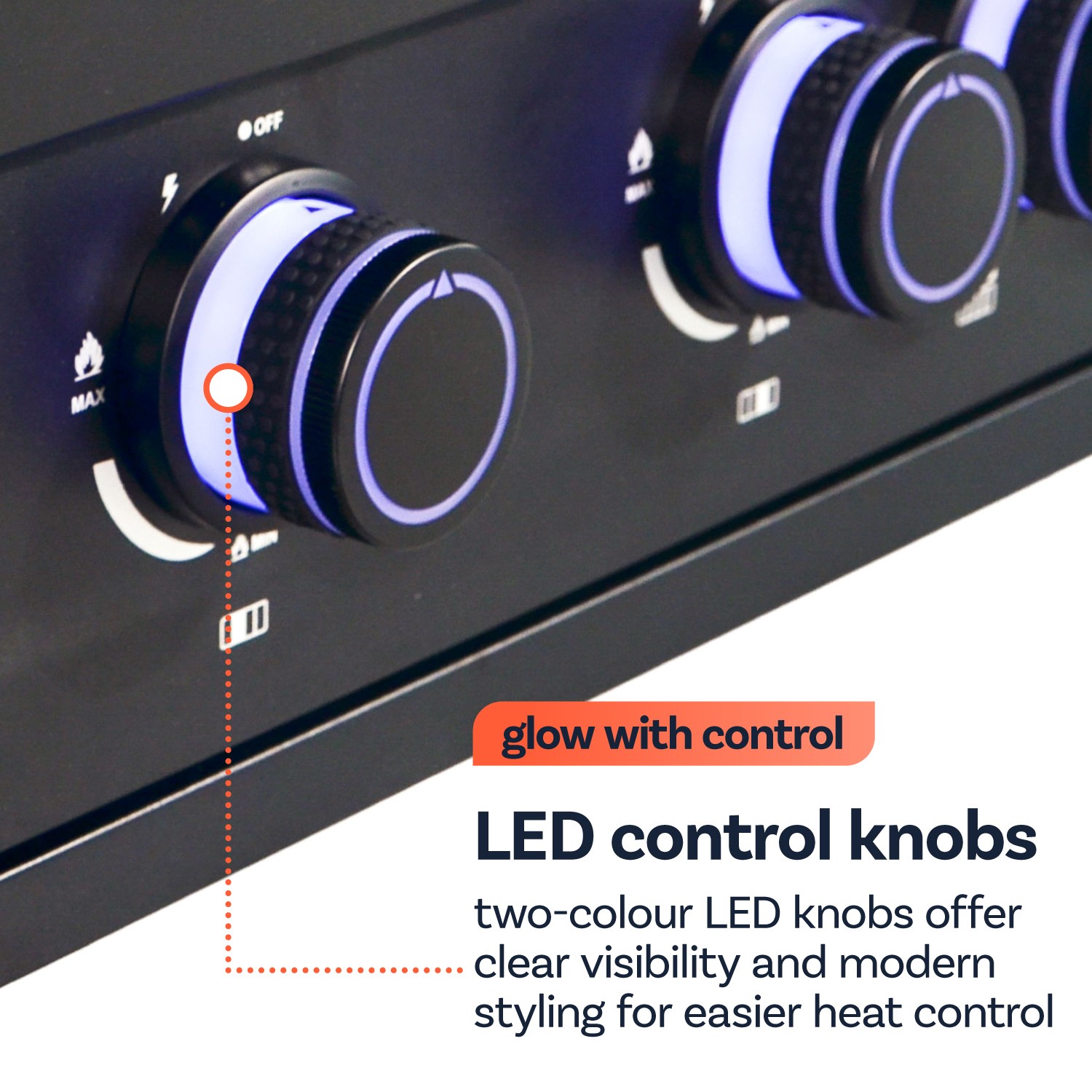 Two-colour LED knobs offer clear visibility and modern styling for easier heat control.