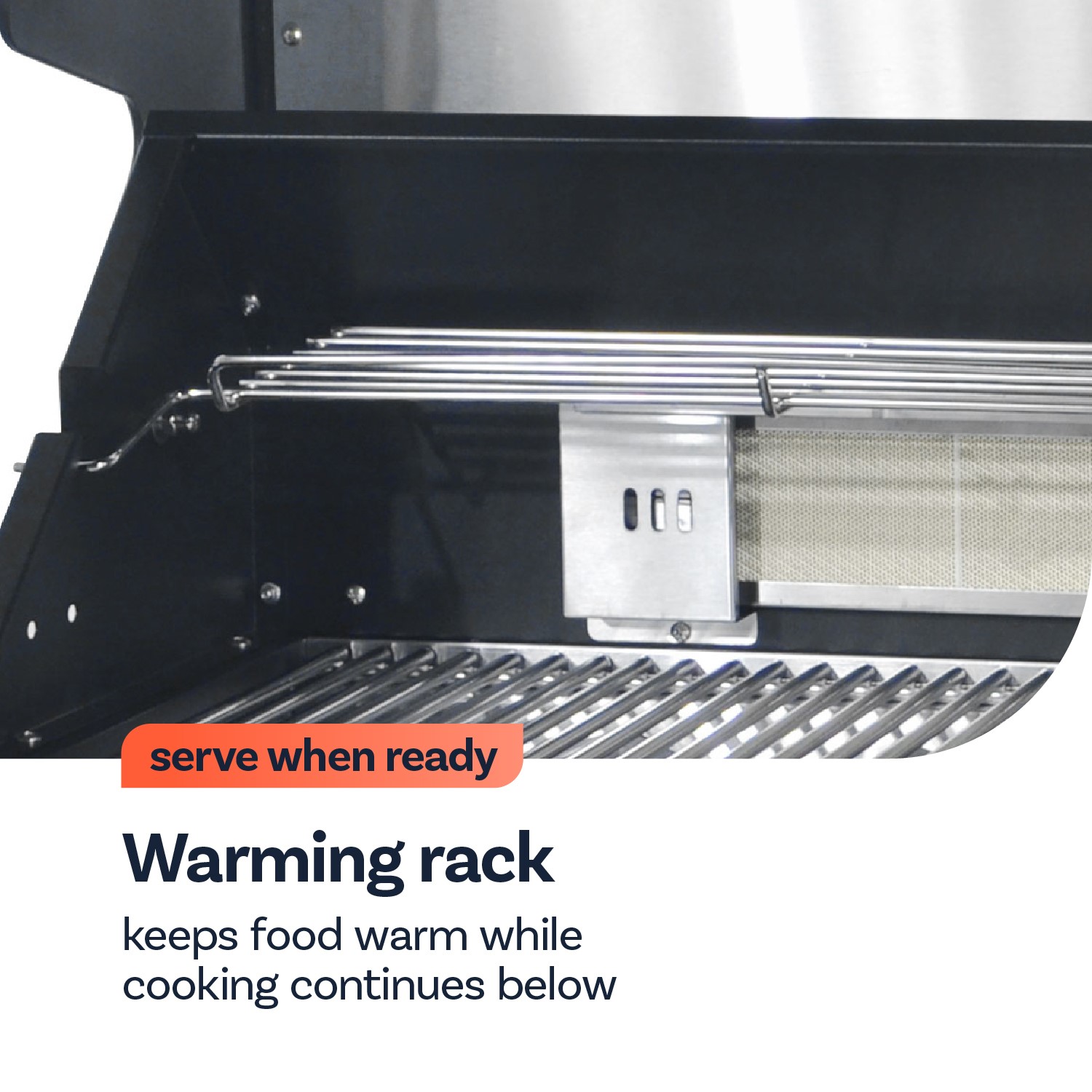 Four high-output stainless steel tube burners provide rapid heat-up and precise temperature control, while the infrared rear burner delivers intense, focused heat—perfect for searing and rotisserie-style cooking that locks in flavour.