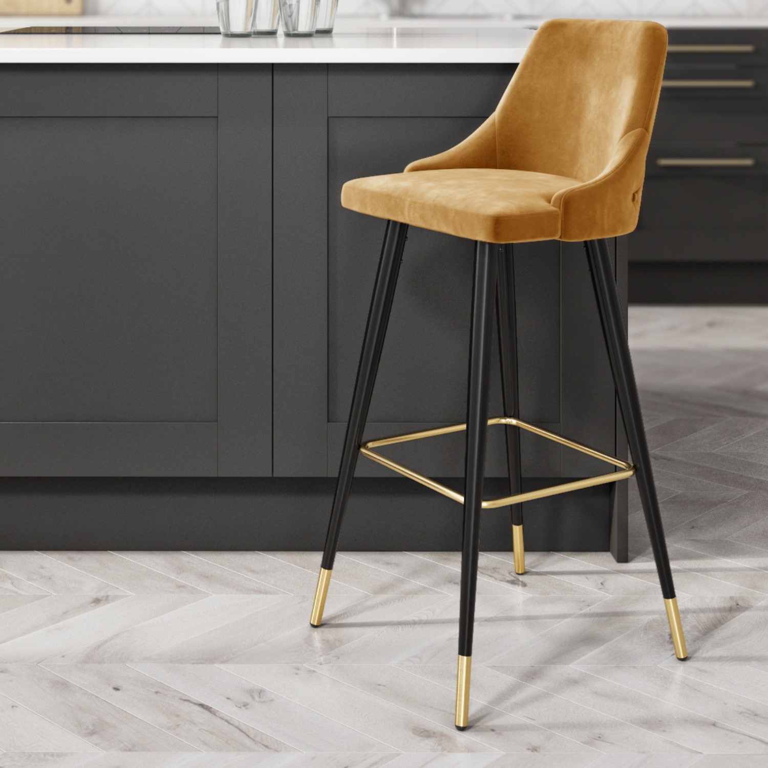 Statement mustard yellow kitchen stool upholstered from luxuriously soft velvet and finished with tapering black legs complemented by gold footrest and tips. The diamond tufted back adds a touch of elegance to finish off the stool.