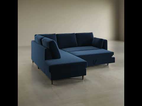 - Navy velvet left hand corner sofa bed with ottoman storage