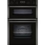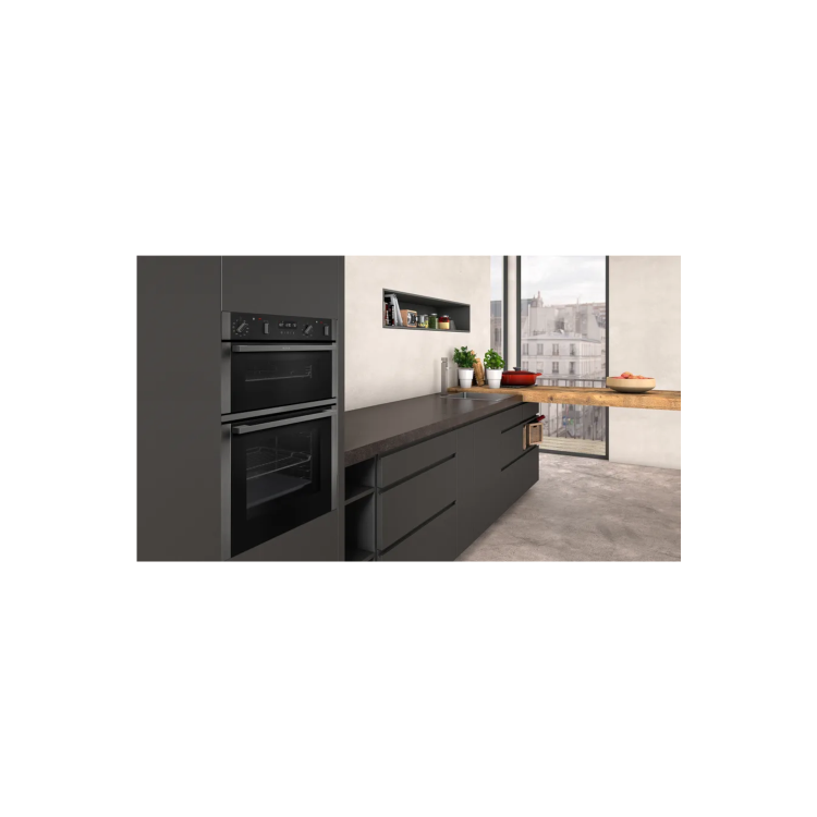 The Neff N50 U2ACM7HG0B built in double oven has a large 71L capacity multifunction oven with 8 heating methods including fan, top/bottom heat, and grill settings along with a 34L conventional oven and grill above. The singlepoint meat probe measures the core temperature of roasts and can be set to switch off the oven when the perfect temperature has been reached this oven also has a pyrolytic cleaning function to leave the oven spotless and a handy steam cleaning function for light cleaning in between.