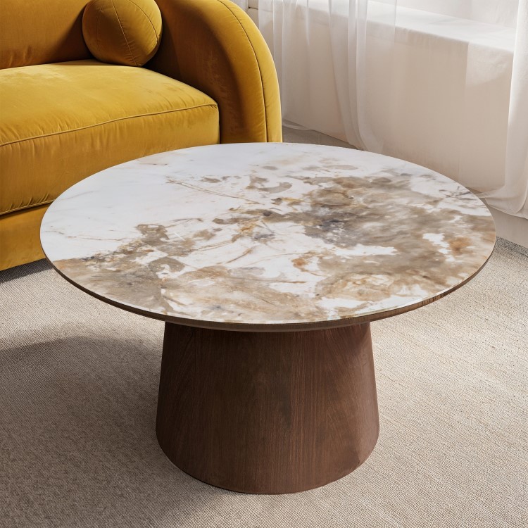 The Malia Coffee Table is a perfect fusion of modern style and mid-century elegance, designed to elevate your living space. Featuring a warm, neutral ceramic top that is both heat and scratch-resistant, it’s supported by a sleek walnut pedestal base that adds a touch of sophistication. The distinctive ceramic top brings a unique and stylish touch to any room.