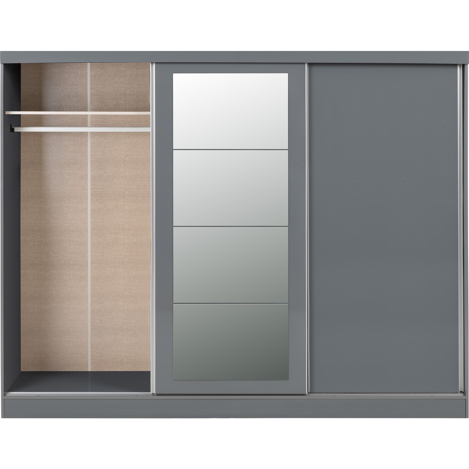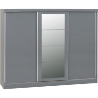 The Nevada 3-Door Sliding Wardrobe is constructed from a combination of durable materials and its stylish grey gloss finish adds a contemporary feel to any bedroom, while including three sliding doors, a full-length mirror and six spacious shelves, ensuring there's plenty of room to Organize your clothes, shoes and accessories while this wardrobe strikes the perfect balance between style and functionality, making it ideal for maximizing storage space.