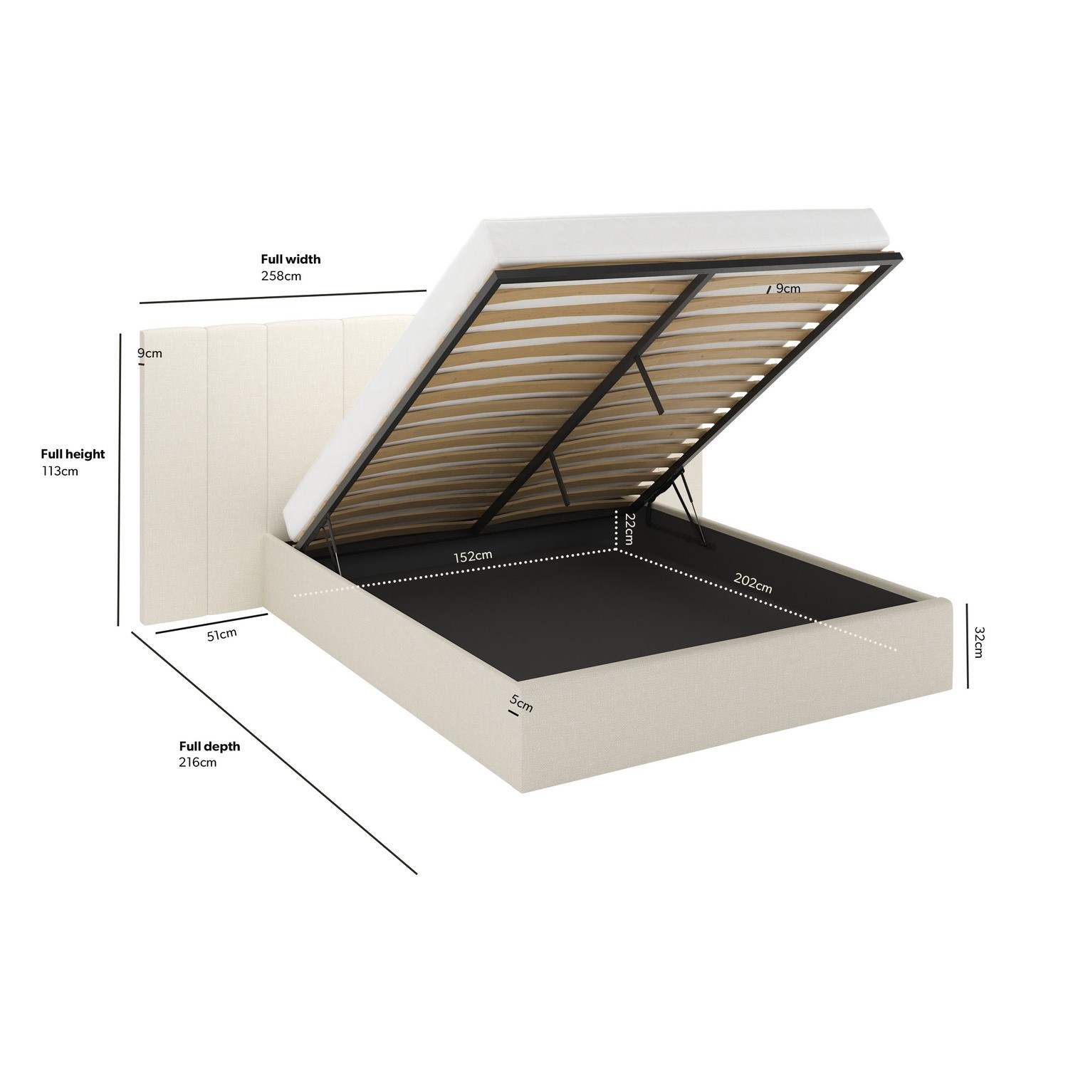 Bring a touch of hotel luxury to your bedroom with the Iman ottoman bed. This bed boasts an elegant long and wide headboard with plush padding and a classic lined detail that instantly elevates the bedroom interior. Upholstered in soft and durable cream fabric that effortlessly blends with any decor. The ottoman storage offers plenty of space to store your clothes and bedding. Its sturdy wood frame ensures lasting durability, while the sprung-slatted base provides ultimate comfort. This bed fits a UK standard king-size mattress.