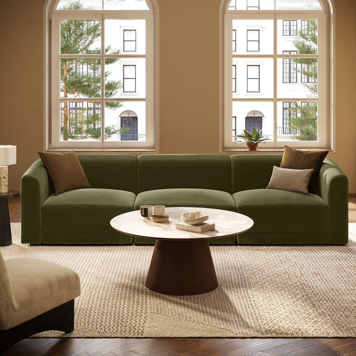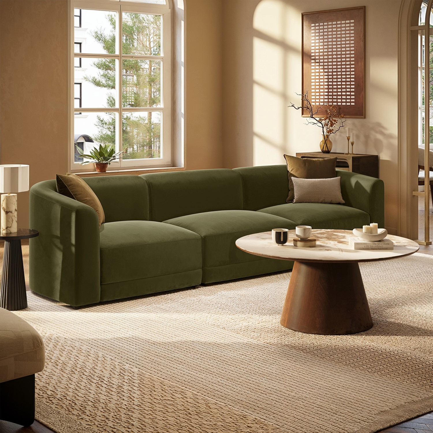 The Laine 4-Seater Modular Sofa combines modern design with gentle curves and a bold, rounded silhouette. Upholstered in soft, durable olive green velvet, it adds a calm, inviting splash of colour to any living space. Designed as a family sofa, it features deep seats, a low-profile modular form, and foam with pocket springs for superior comfort and support. Spacious, stylish, and versatile, this sofa is the perfect place to unwind.