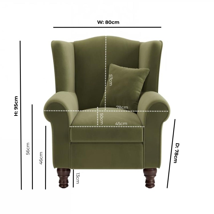 Create a cosy spot in your home with the Rupert armchair. Its high back and winged silhouette bring timeless elegance, while the luxuriously soft olive green velvet fabric adds a serene, sophisticated touch to your decor. A matching scatter cushion is included for added comfort and style. Designed with versatility in mind, this armchair can also be styled as an accent chair, offering both comfort and timeless appeal. Expertly crafted for comfort and longevity, this armchair is a beautiful blend of classic design and lasting quality.