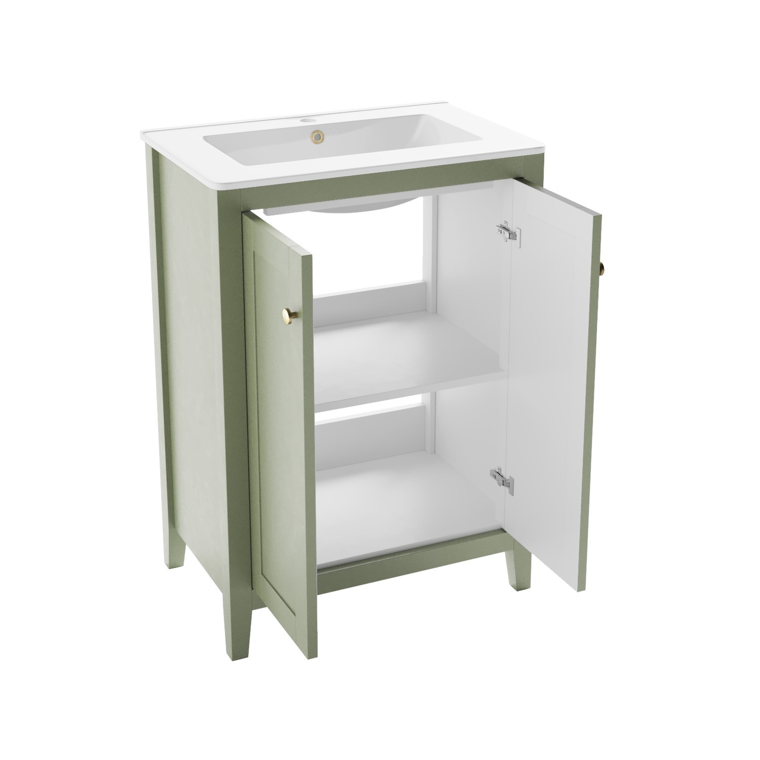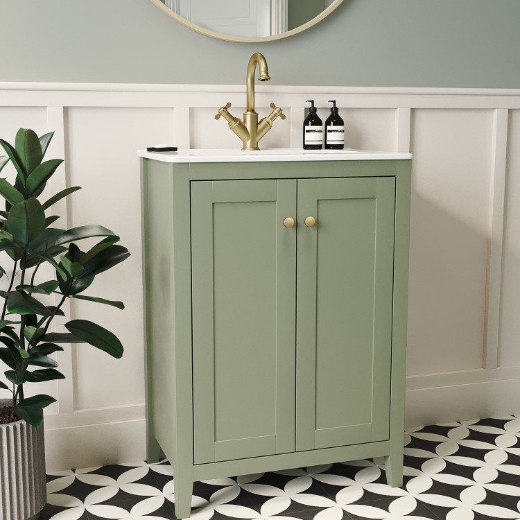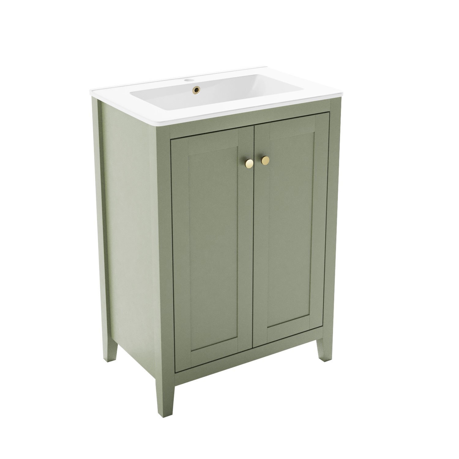 Upgrade your bathroom instantly with the elegant Kinsley 600mm floor standing basin vanity basin unit. Designed and hand crafted with a classic shaker-style door front and finished in a chic sage green matt tone; it is perfect for transitional spaces. The Freestanding design makes it a standout feature piece, perfect for elevating both compact and spacious bathrooms. The integrated ceramic basin features a luxurious, crisp gloss-white finish that not only brightens your space but is designed for everyday practicality making cleaning quick and easy. With a single pre-drilled tap hole, it offers effortless compatibility with most mono mixers, making it simple to customise your look with the tap of your choice.