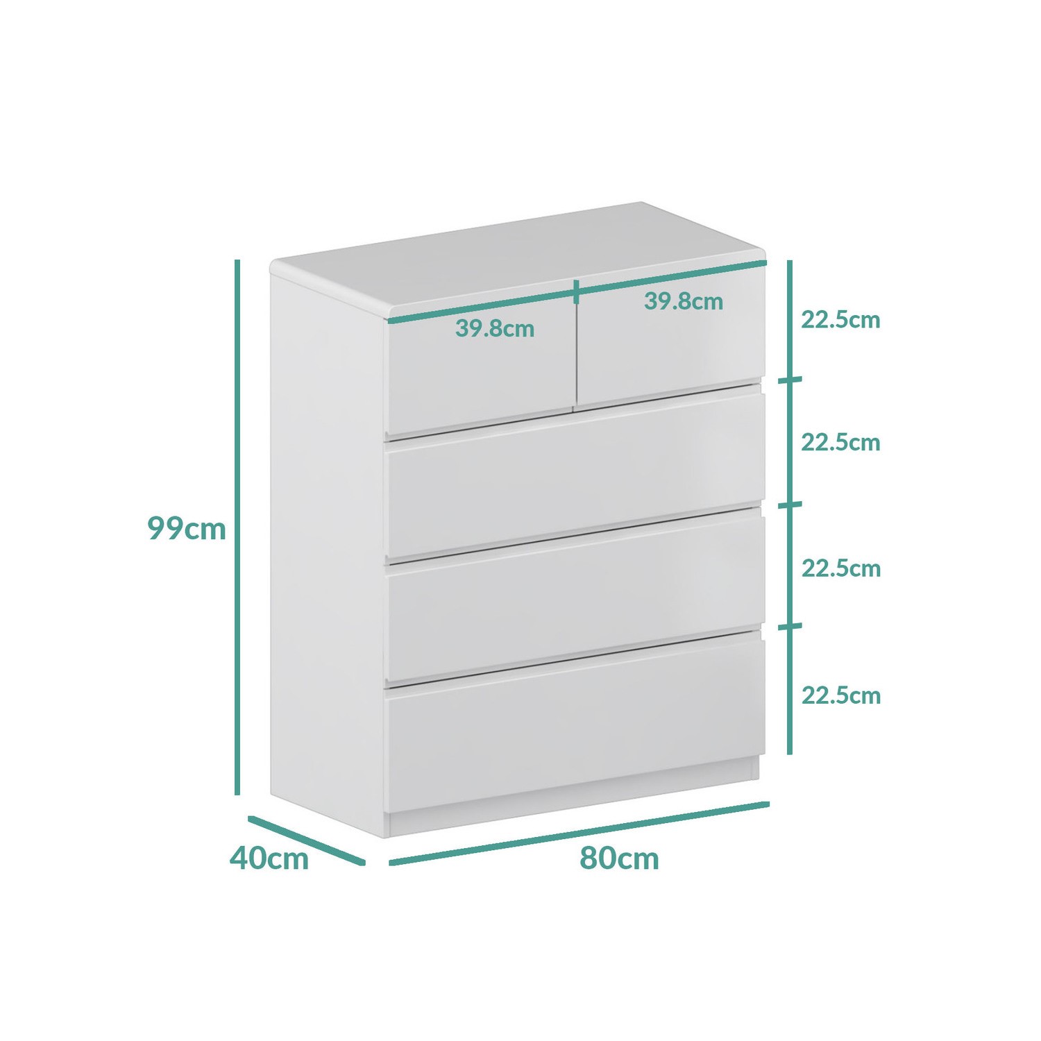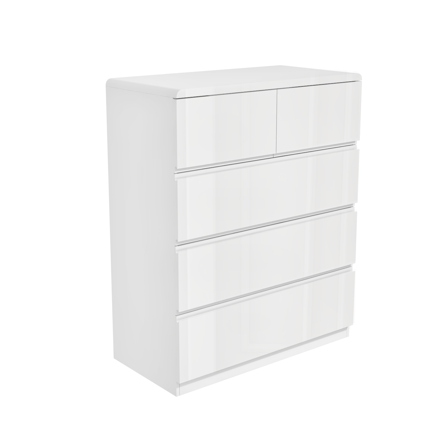 The perfect piece for creating a contemporary abode, this Lyra chest of drawers would make a stylish addition to any bedroom. The white high gloss finish gives it a natural shine, and it'll coordinate well with any décor. It'll look fresh and modern for years to come. It features five drawers with integrated handles which give it a seamless look; there's ample storage space for your folded items and worldly possessions. The top is perfect for holding your personal belongings, a fresh vase of flowers or even a TV!