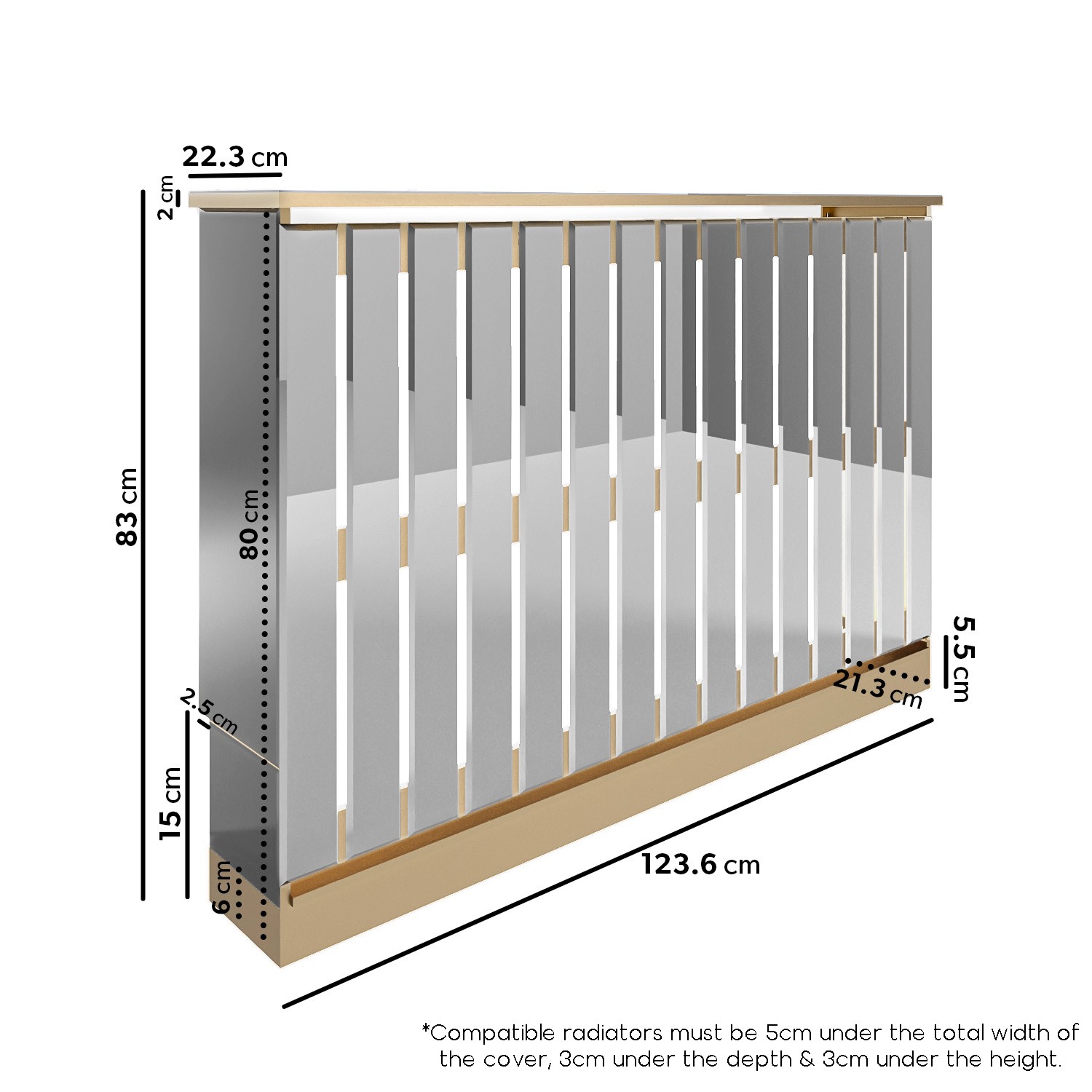 Transform the look of your hallway entrance or living room with this luxurious radiator cover. Its unique bevelled mirror design and subtle gold finished base and top are so eye-catching. Thanks to the generous tabletop space, it can be used as a stylish display or storage space as it doubles up as a console table. It also fits flush regardless of your skirting board and includes wall mounting brackets to securely attach to your wall.