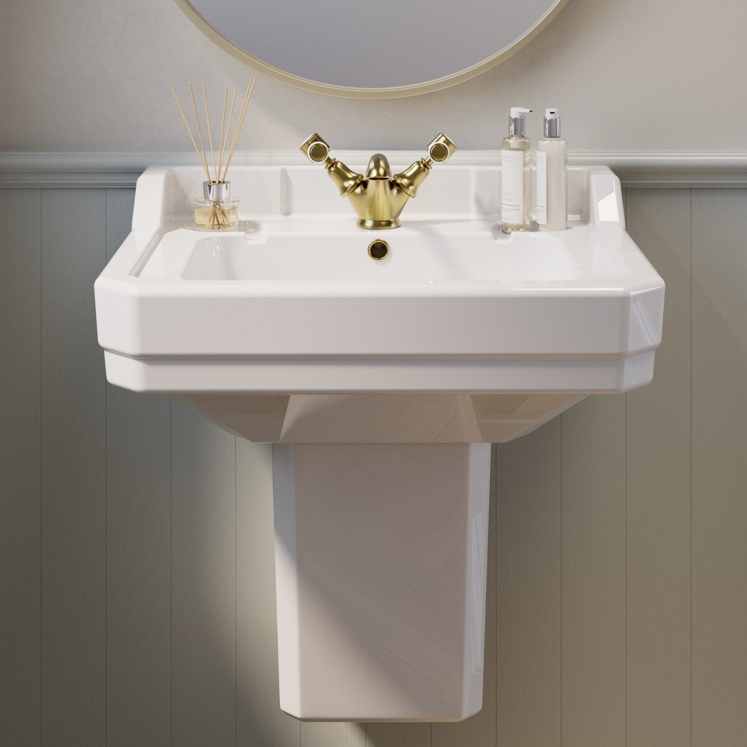 This semi pedestal traditional basin oozes period charm with its vintage aesthetics, helping you achieve that elegant British bathroom look from eras of great design. It has a pre-drilled tap hole; a tap isn't included, so you're free to choose the tap of your choice.
