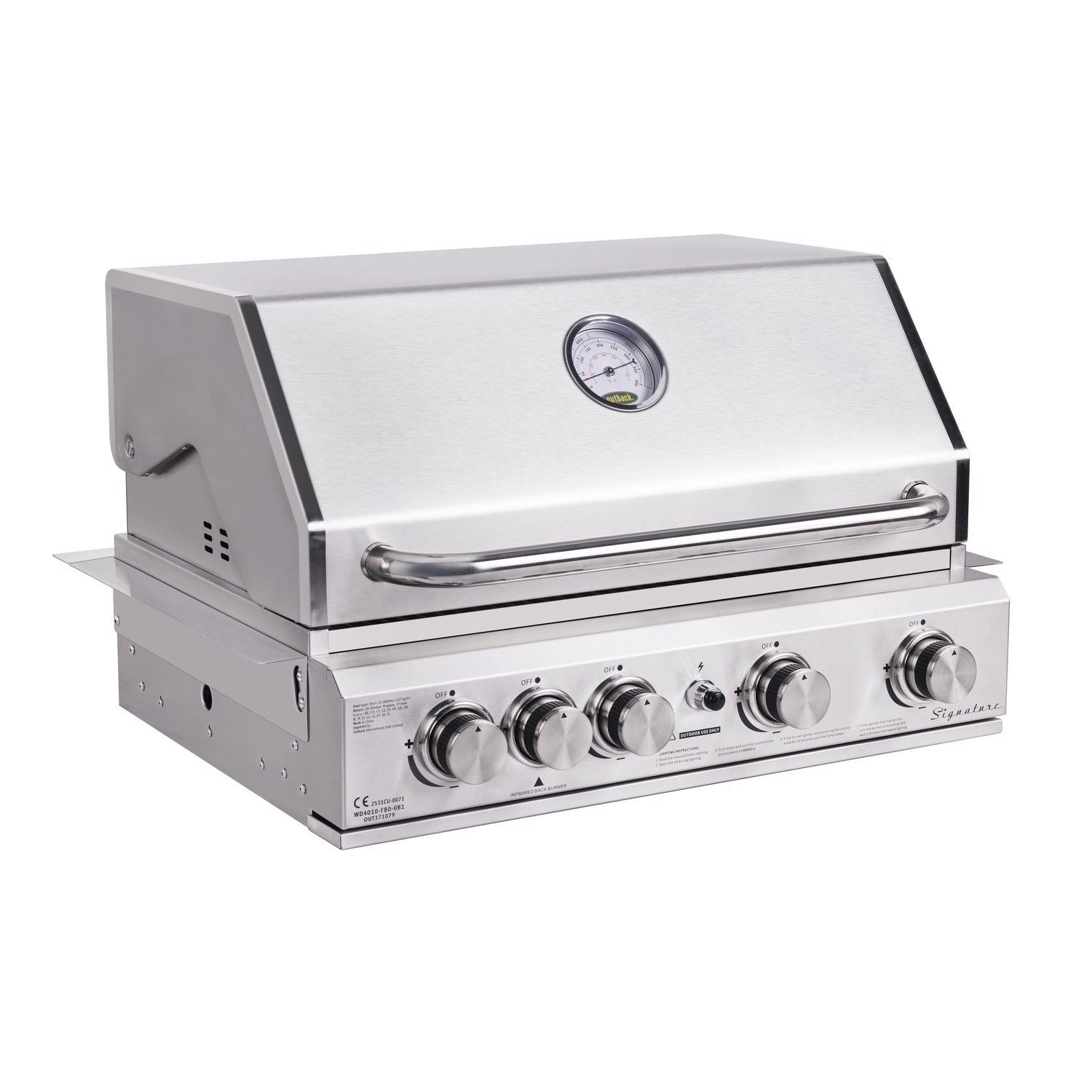 The Outback Signature 4 Burner Hybrid Built offers customers the flexibility to create their own exclusive outdoor entertaining area that includes this top of the range high grade fully stainless steel grill. Signature Bulit In double skin hood and body are constructed from 304 stainless steel guaranteeing maximum corrosion resistance against even the worst outdoor environments. Every part is constructed of stainless steel, including high grade stainless steel grill four burners and warming rack. The hybrid function includes a charcoal basket with the option to cook with Outback Coconut Shell Briquettes, allowing guests to enjoy that authentic charcoal flavour, with easier charcoal lighting using gas. Also inclues ceramic rear burner for rotisserie cooking with integrated with the Multi-Cooking Surface system the interchangeable grill can be switched to use a pizza stone, griddle, paella/skillet pan, etc or other Outback MCS cooking surfaces for extra versatility in your cooking experience. Signature 4 Burner Bulit-In is supplied with stainless steel hose located at the rear of the BBQ giving the option to hide the gas cylinder inside your BBQ structure with propane regulator.