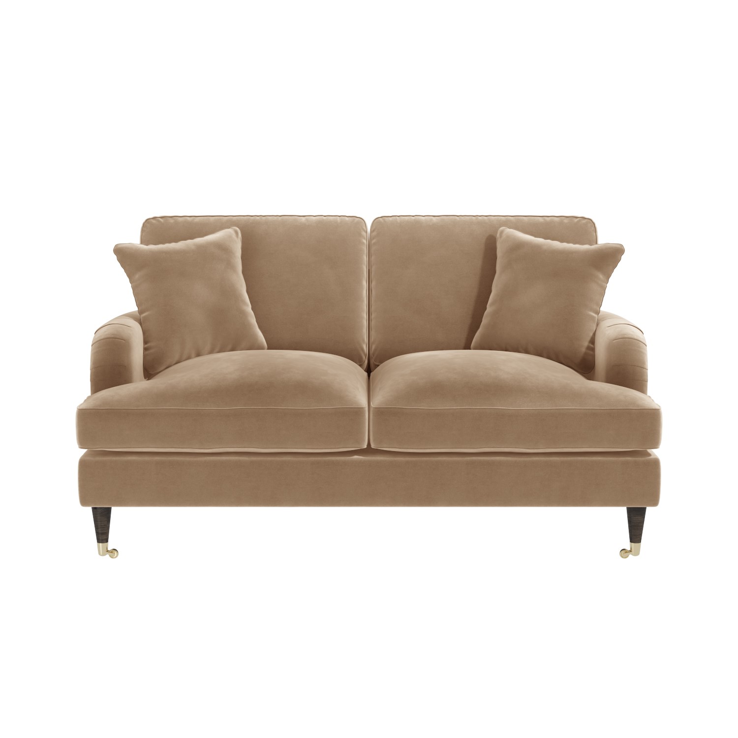 Discover maximum comfort and minimum maintenance with this gorgeous sofa. This plush Payton two-seater sofa offers traditional styling with a modern twist thanks to its dark wooden legs with gold accent front castors and classic ruched saddle arms. Beautifully tailored and upholstered in a warm beige, it brings a splash of natural warmth to your living space, making it the perfect statement piece. It comfortably seats three and comes accompanied with two matching throw cushions which add a final flourish of elegance.