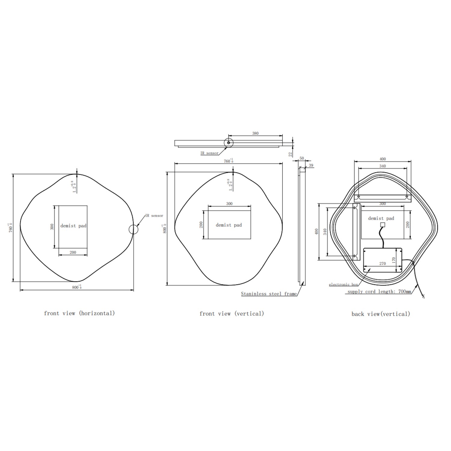 Add the perfect finishing touch to your space with this stylish organic shaped mirror with a sleek matt black deep frame and backlit light. This mirror can be hung both vertically and horizontally, adding additional versatility to your bathroom space. The mirror has a hidden infrared sensor located in the centre bottom. To activate the light and demisting pad, move your hand across the sensor once at a distance of around 5cm. To turn it off, move your hand across the sensor again. Hold your hand in front of the sensor to change the colour temperature between a warm and cool light. It's IP44 rated, so it's safe to use in the bathroom.