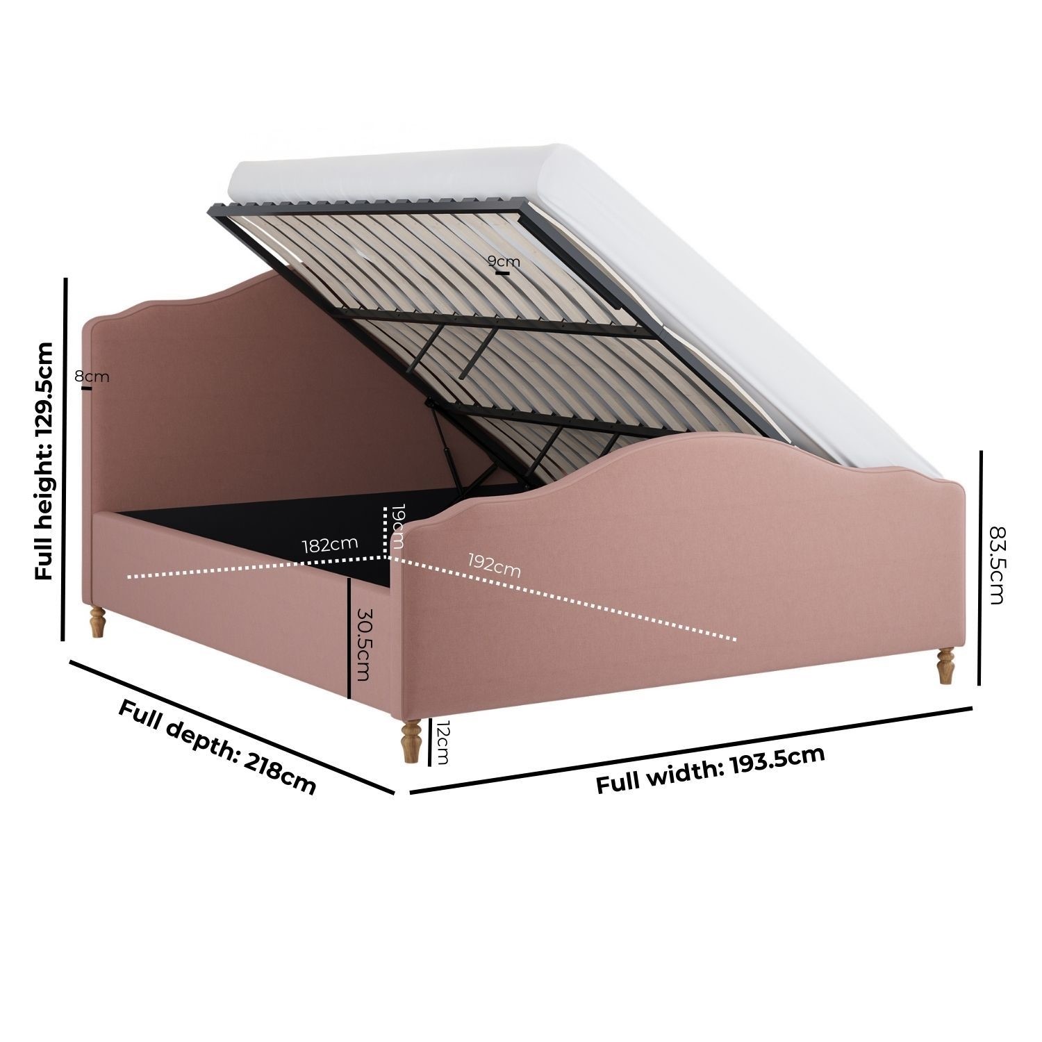 Elevate your bedroom with the Marie Bed, a refined blend of French-inspired elegance and modern practicality. Its arched, piped headboard and soft, dusky pink chenille upholstery create a warm, timeless focal point in any space. A smooth side-lift ottoman reveals generous hidden storage, perfect for linens, blankets, and seasonal essentials, and can be assembled during setup to open from either the left or right to suit your room layout. It has a solid storage base that keeps stored items protected, clean, and neatly organised. Its wooden sprung slatted base ensures enhanced comfort and support. Finished with turned beech wood legs, this bed offers enduring stability with a classic touch.