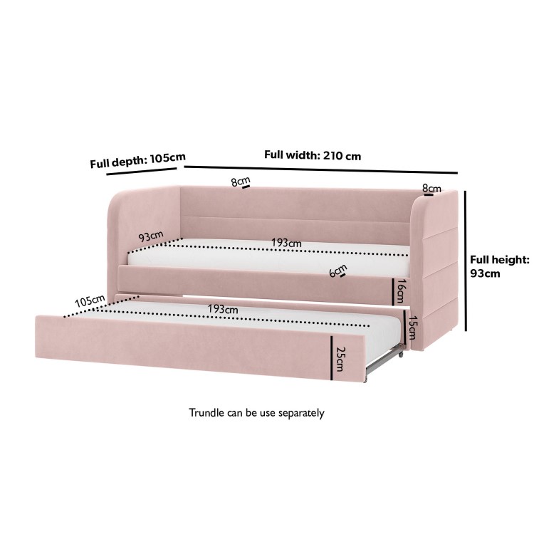 Give your home a stylish and practical upgrade with the Newton Day Bed with Trundle. Designed for comfort and versatility, it offers a chic seating area by day and sleeps two comfortably by night. The modern ribbed design adds a touch of sophistication, while the soft pink velvet upholstery blends beautifully with any decor. The smooth pull-out trundle can be positioned anywhere in the room and tucks neatly away out of sight during the day, making it perfect for small apartments, guest rooms, or multipurpose spaces.