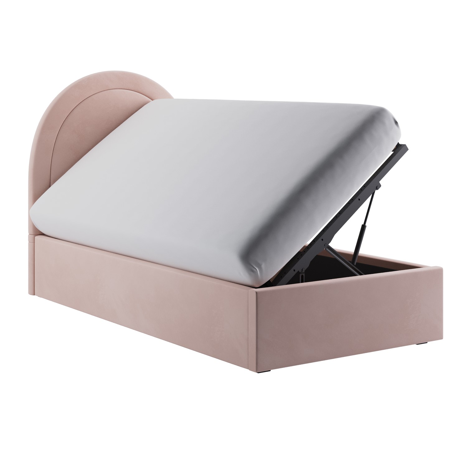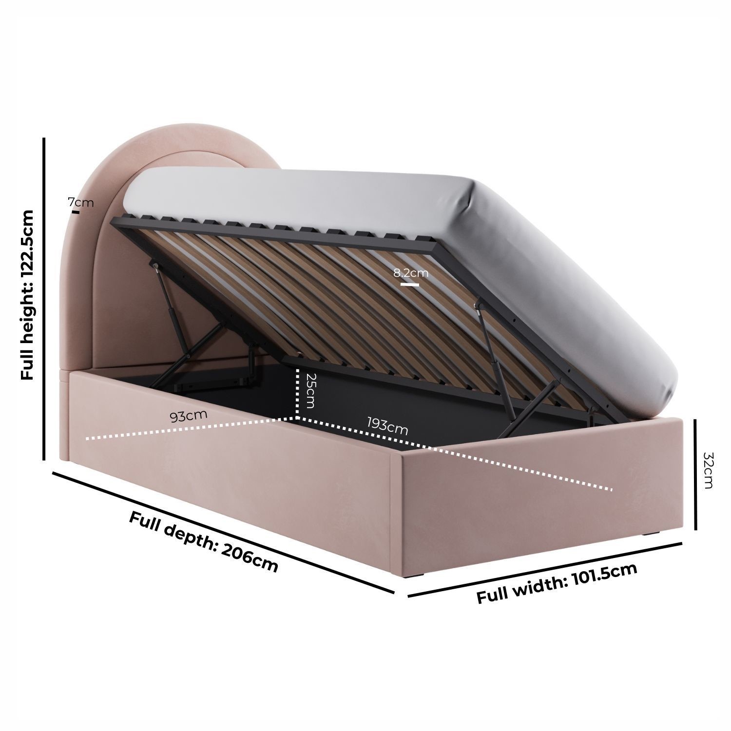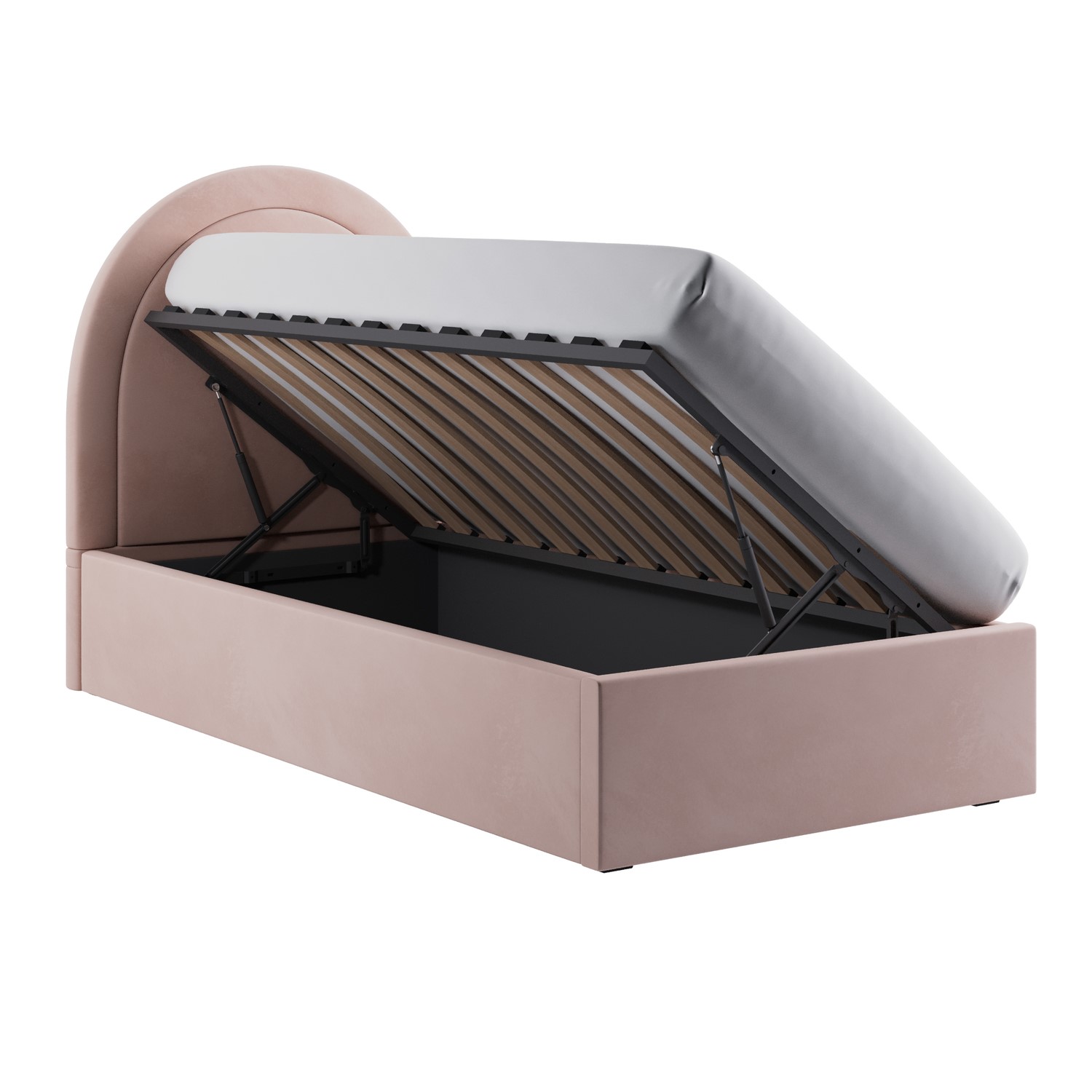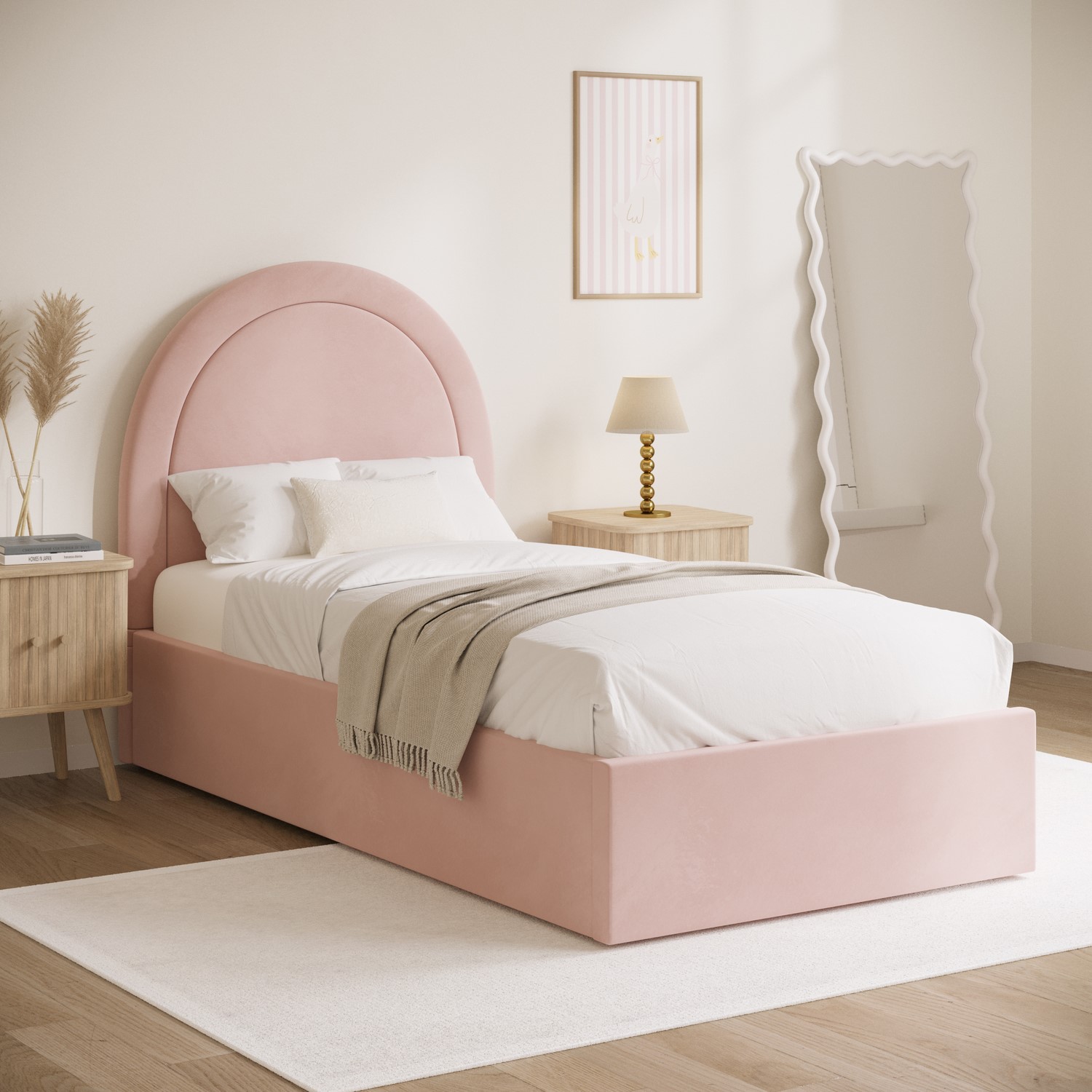 Create an instant focal point with the Nora single ottoman bed. It's beautifully upholstered in a soft-touch pink velvet fabric to suit any bedroom decor, and the arched headboard makes it a real statement piece. The side-opening ottoman storage features a gas-lift mechanism and is perfect for storing extra bedding and out-of-season clothes. The hardwood frame and sprung-slatted base provide sturdy mattress support. This bed fits a UK standard single-size mattress, which can be purchased with a 10% discount when bought with this bed - see our package deals below.
