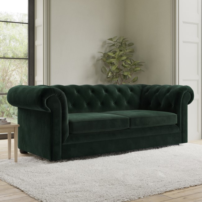 Add a touch of class to any room in your home with this traditional Bronte pull out sofa bed. It has classic Chesterfield features such as luxurious scrolled arms, button tufted back and arms and turned wooden feet. Velvet upholstery and comfortable spongy foam-filled cushions make it cosy to sit on. Plus, it's quick and easy to transform into a sofa bed and even comes with a built-in mattress, giving guests a restful night’s sleep. It has been built to last with its durable wooden sofa frame and metal bed frame construction.