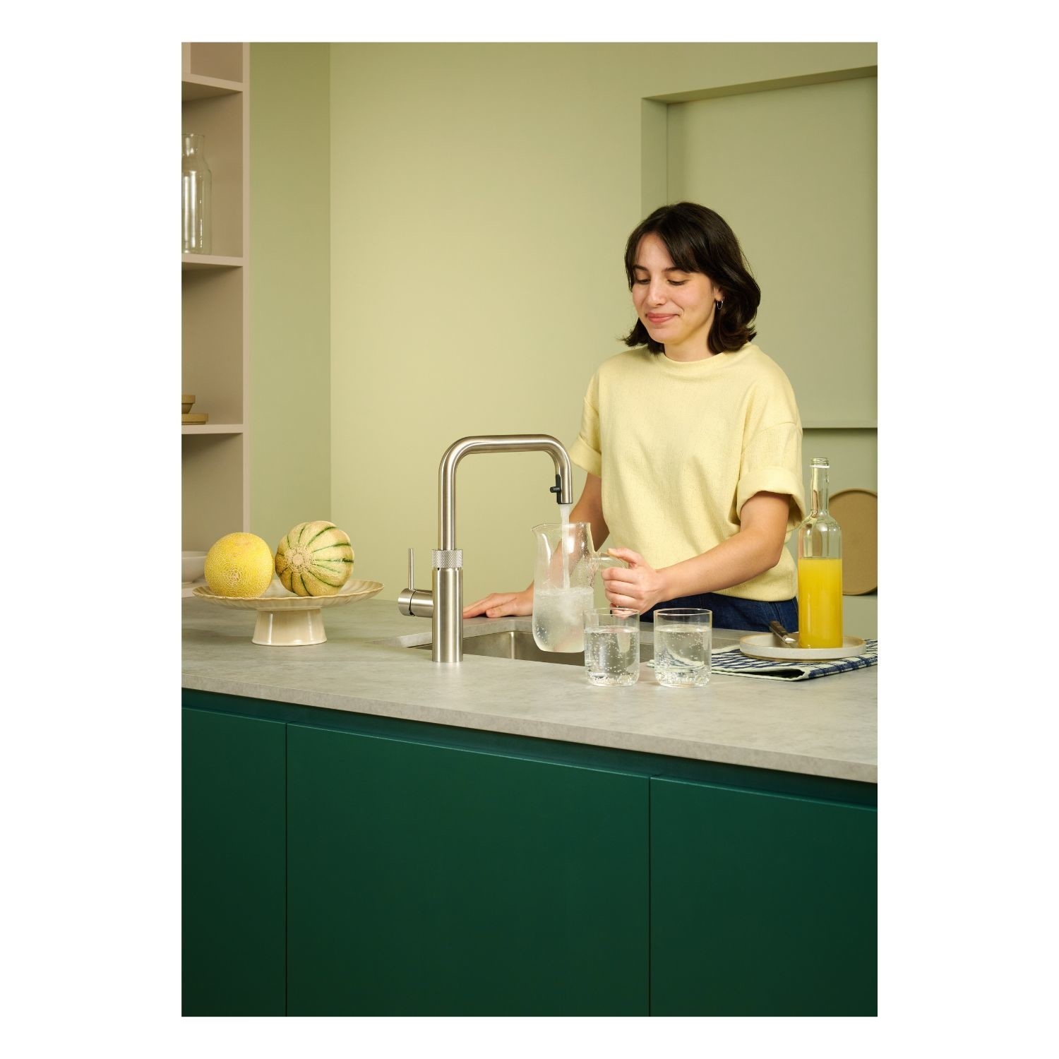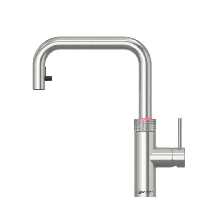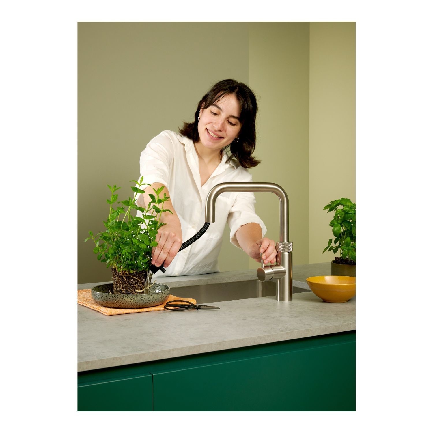 The Quooker Flex Square tap in brushed stainless steel combines flexibility and high functionality. Its pull-out hose allows extended reach for rinsing vegetables, cleaning large pans, and accessing every corner of the sink, while still delivering cold, hot, and instant 100°C boiling water from one tap. Constructed from solid stainless steel, it is durable and reliable, and the precision ceramic valve ensures smooth, consistent operation. The brushed stainless-steel finish adds a subtle, low-maintenance texture that complements any kitchen style.
