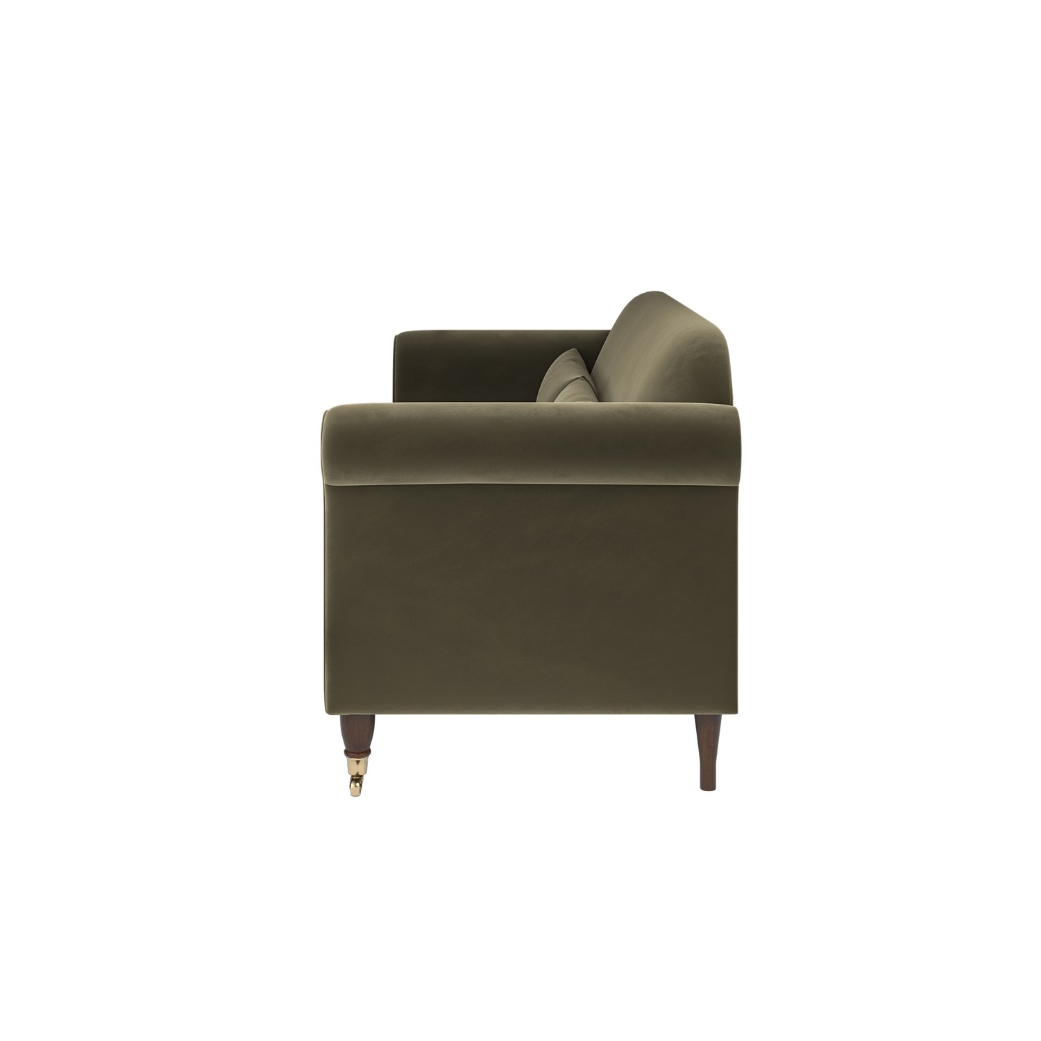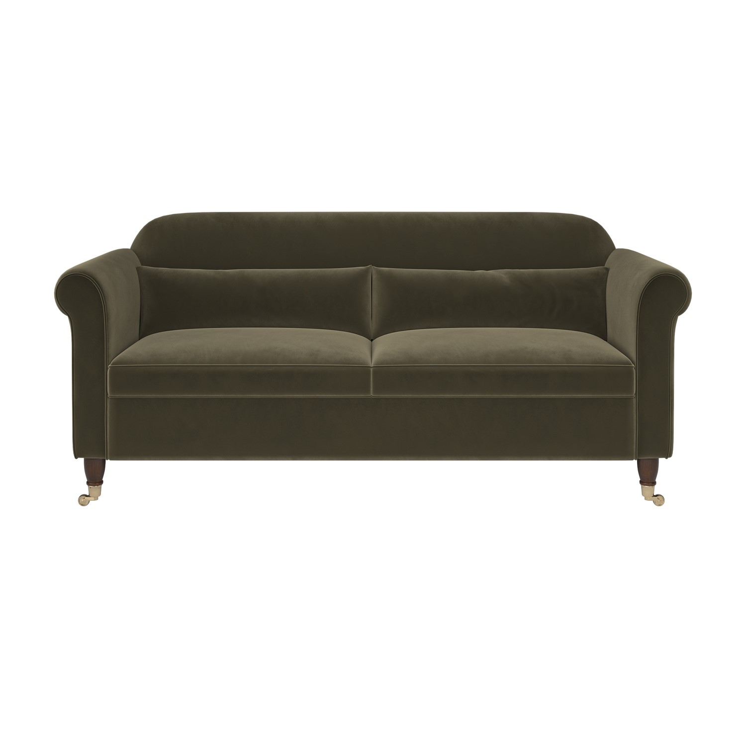 The Ramona Khaki Green Velvet 3-Seater Traditional Sofa brings a timeless elegance to any living room. Upholstered in soft yet durable khaki green velvet, Ramona offers both warmth and sophistication, making it an inviting centrepiece for your space. With classic scroll arms and turned wooden legs with castors, it blends traditional charm with modern touches. The foam and fibre-filled seats ensure long-lasting comfort and support, while the removable cushion covers make cleaning easy. Perfect for families, the Ramona sofa adds character and comfort, making it an ideal choice for any home.