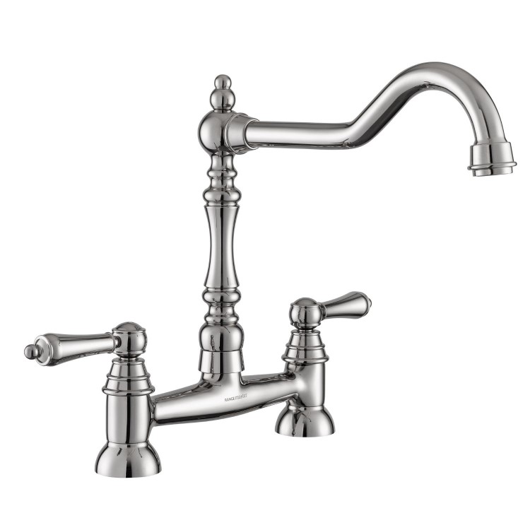 The Rangemaster Waverley Bridge Tap in Polished Nickel exudes timeless farmhouse elegance, featuring beautifully contoured dual handles and a classic bridge spout that enhances any kitchen, especially when paired with fire-clay or ceramic sinks.