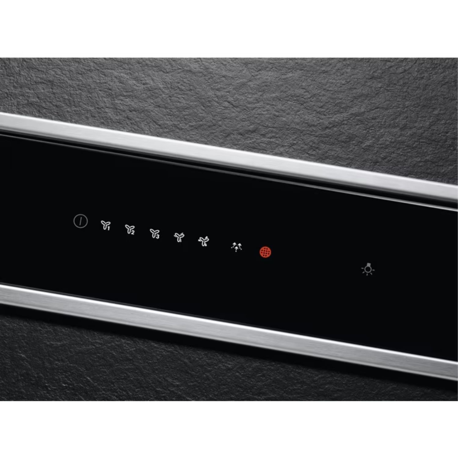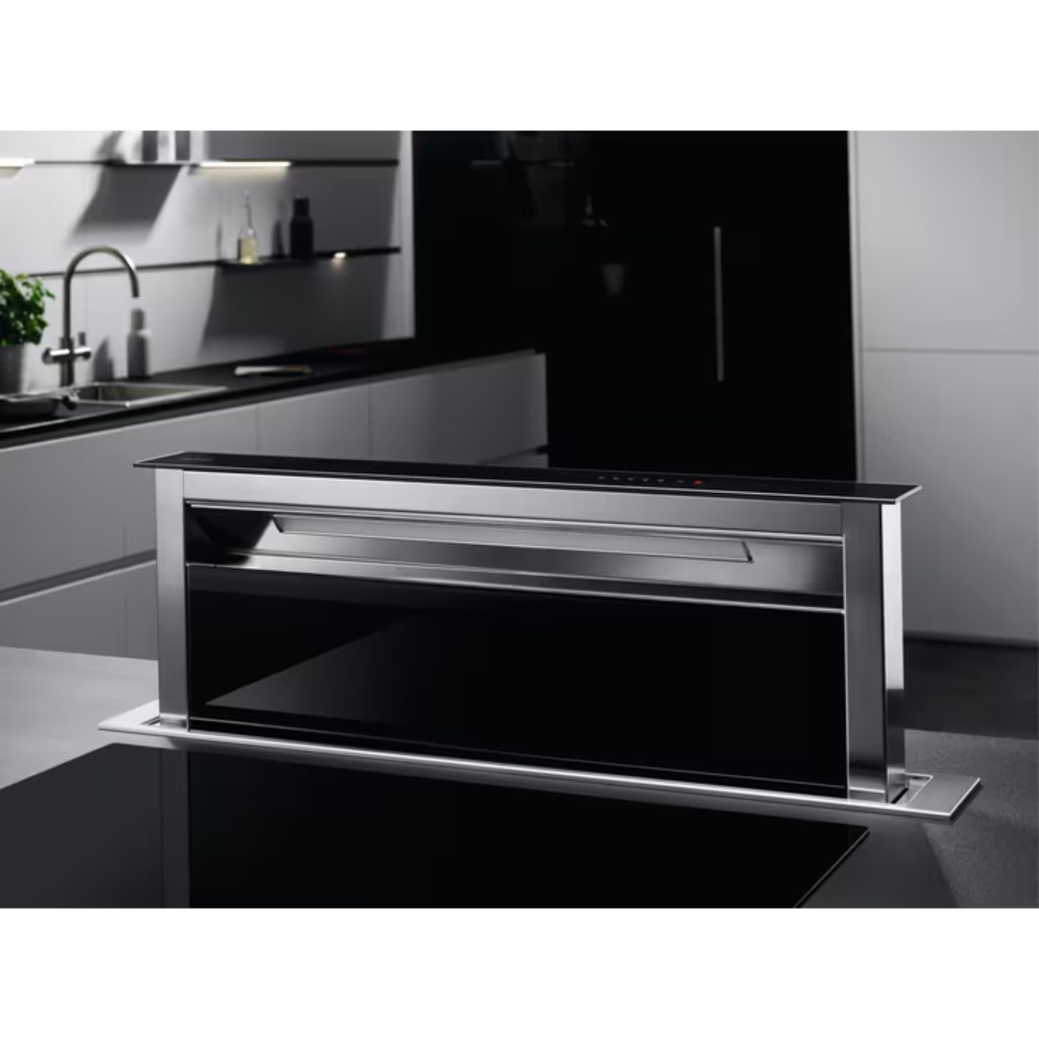The DDE5980G downdraft cooker hood is a sleek stainless steel unit from AEG. As a downdraft hood it is hidden away in your worktop until you need it. Simply push a button to raise it from the worktop and activate it when you're cooking. When you are finished cooking, just slide it down to leave a clean and spacious worktop.